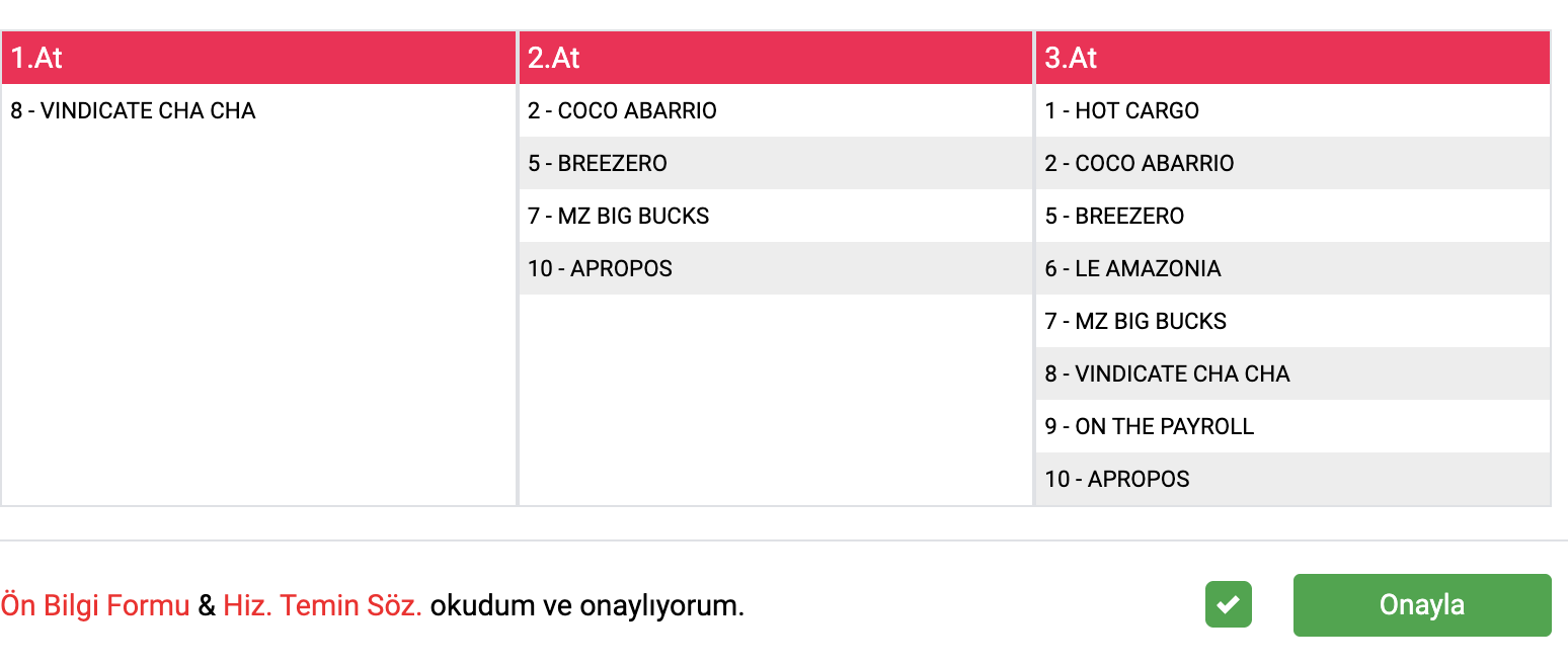 (Algoritma çıkan atlara göre otomatik kupon güncellemektedir. Güncel kupon için Altılı Bülteni sayfamızı ziyaret edin.)