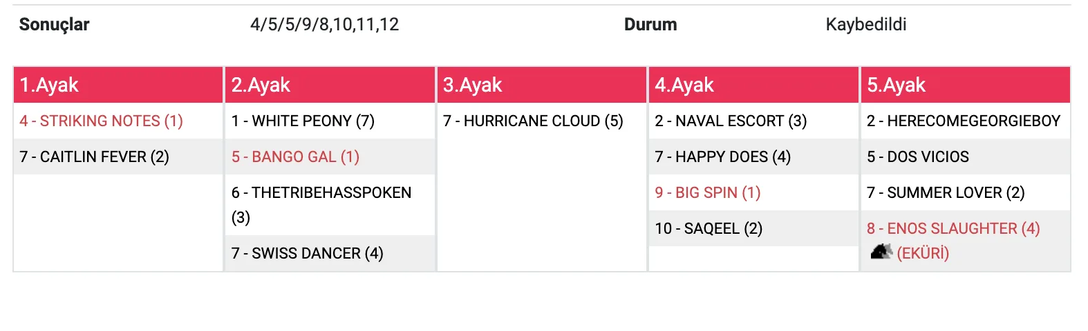 Son ayak (5)Sweet Scorecard gelmesine ragmen (1.60 ganyan) 5’Lİ GANYAN(3,4/6/3/6/1,3,4,5): 3.639,07TL verdi. gunu kurtarirmis. Son ayak tek veya en cok 2 atmis. Son ayak fobisinden gitti kupon.