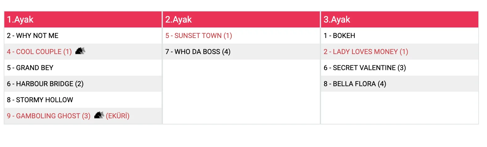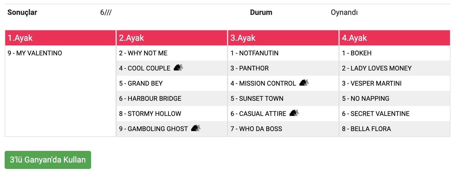 (Algoritma çıkan atlara göre otomatik kupon güncellemektedir. Güncel kupon için Altılı Bülteni sayfamızı ziyaret edin.)