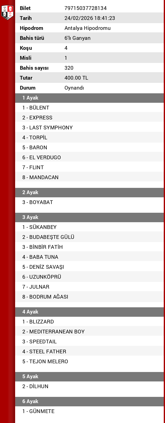 Altılı 1 — Tarih: 24.02.2026 | Altılı Başlangıç: 17:15 | Pist: Antalya