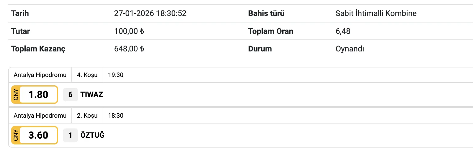 Sagolun Adminim, Tıwaz iyi oldu biraz tazelendik, sabit ihtimalli kombine ve mislilik ilk 3’lu ganyan tuttu. Aynen sira sizde :), sizin Bora Khan’i gecersek son ayak da gelir diye umuyorum🙏 Ayrica 7’li plasem 7’li ganyan olaydi 4’te 4 olacakti. Bakalim 7’li ganyan çok sıkı devirler ile çılgın ikramiyelere ulasacak. Bu sene birileri ciddi zengin olacak gibi. O bizler olsak bari :)