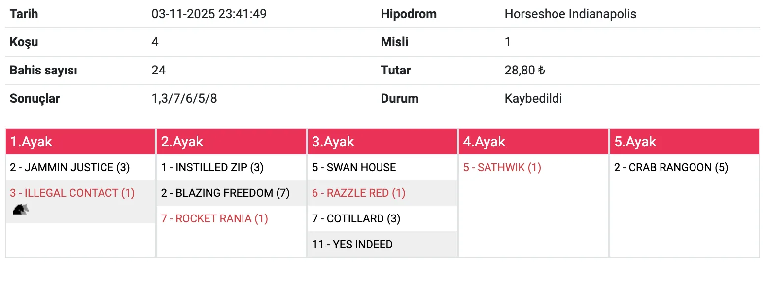Altılı 2 — Tarih: 03.11.2025 | Altılı Başlangıç: 23:12 | Pist: Horseshoe Indianapolis ABD
