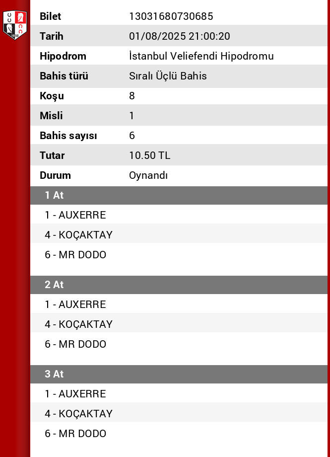 2.KOŞU: 6 – 5 – 1 – 8 – 3 – 7 – 10