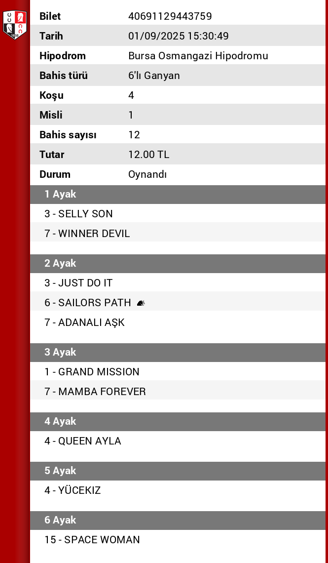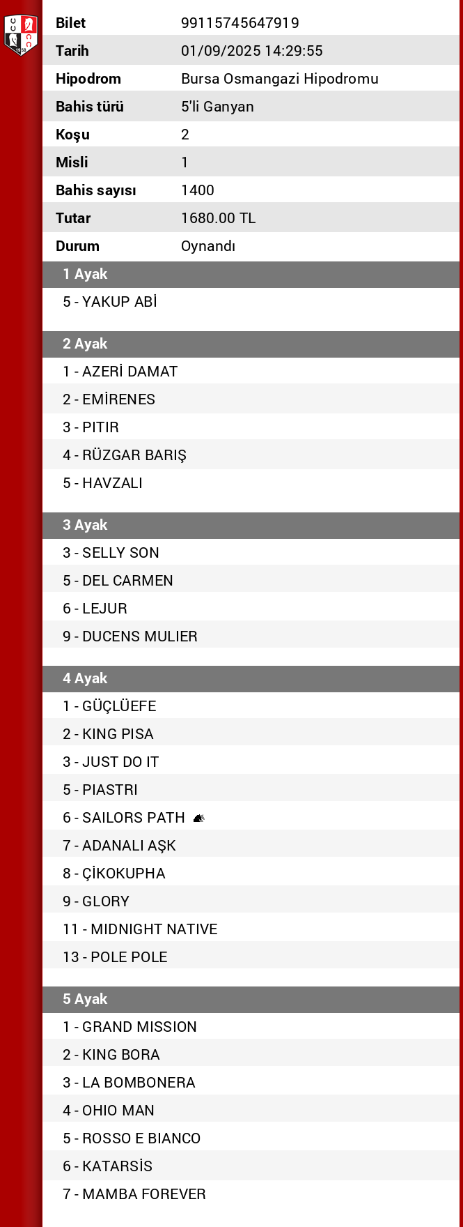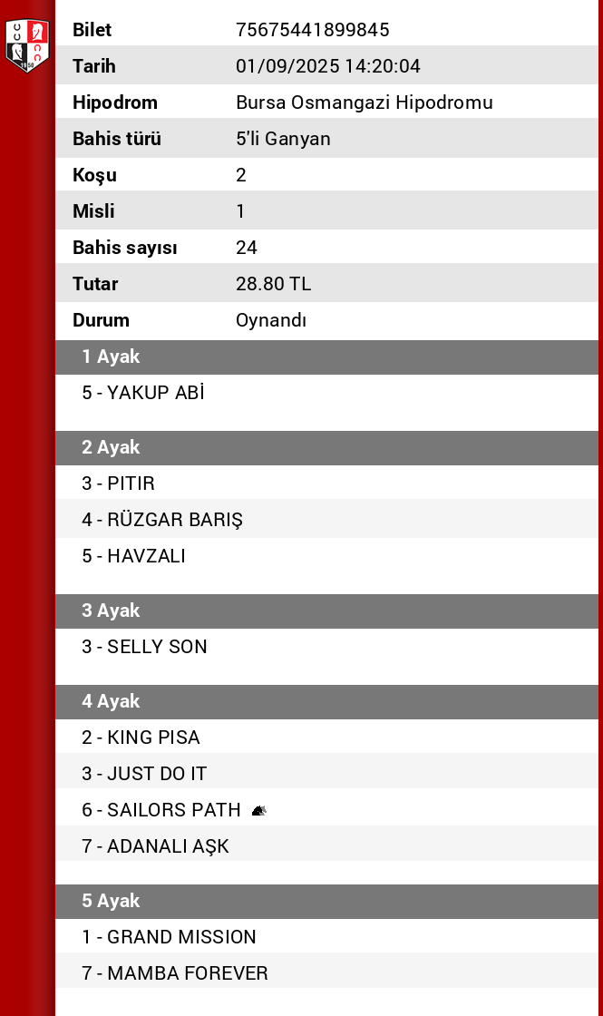 Bilet no 49162274047662 Bahis türü 5’li Ganyan