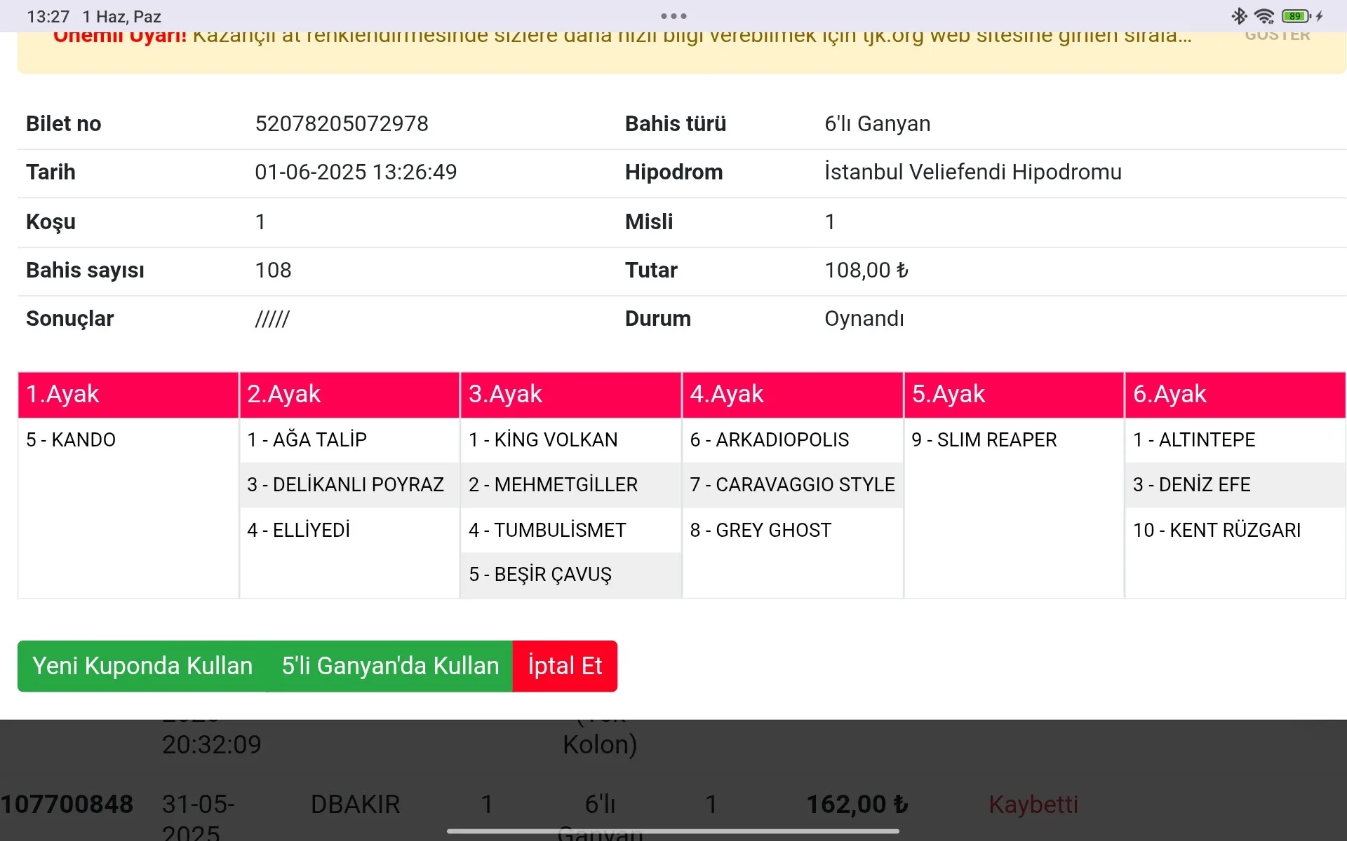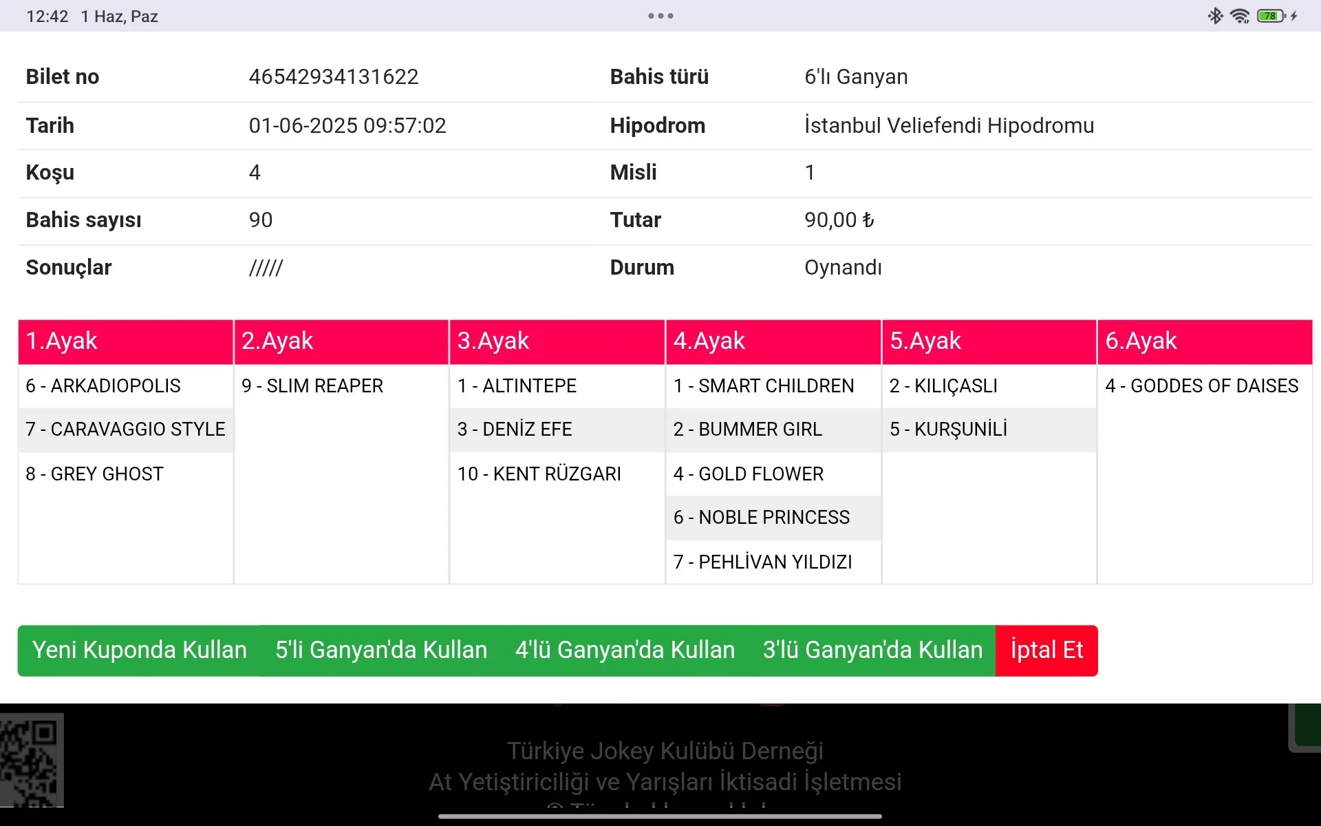 6’li ilk ayak kotu yatti. 2 atim one cikmisken sagolsun bomba ve tehlikeli jokey Nizamettin Demir 2 ati birden transit gecti.