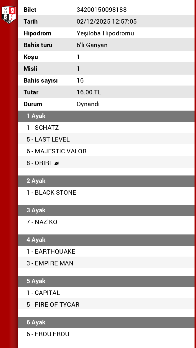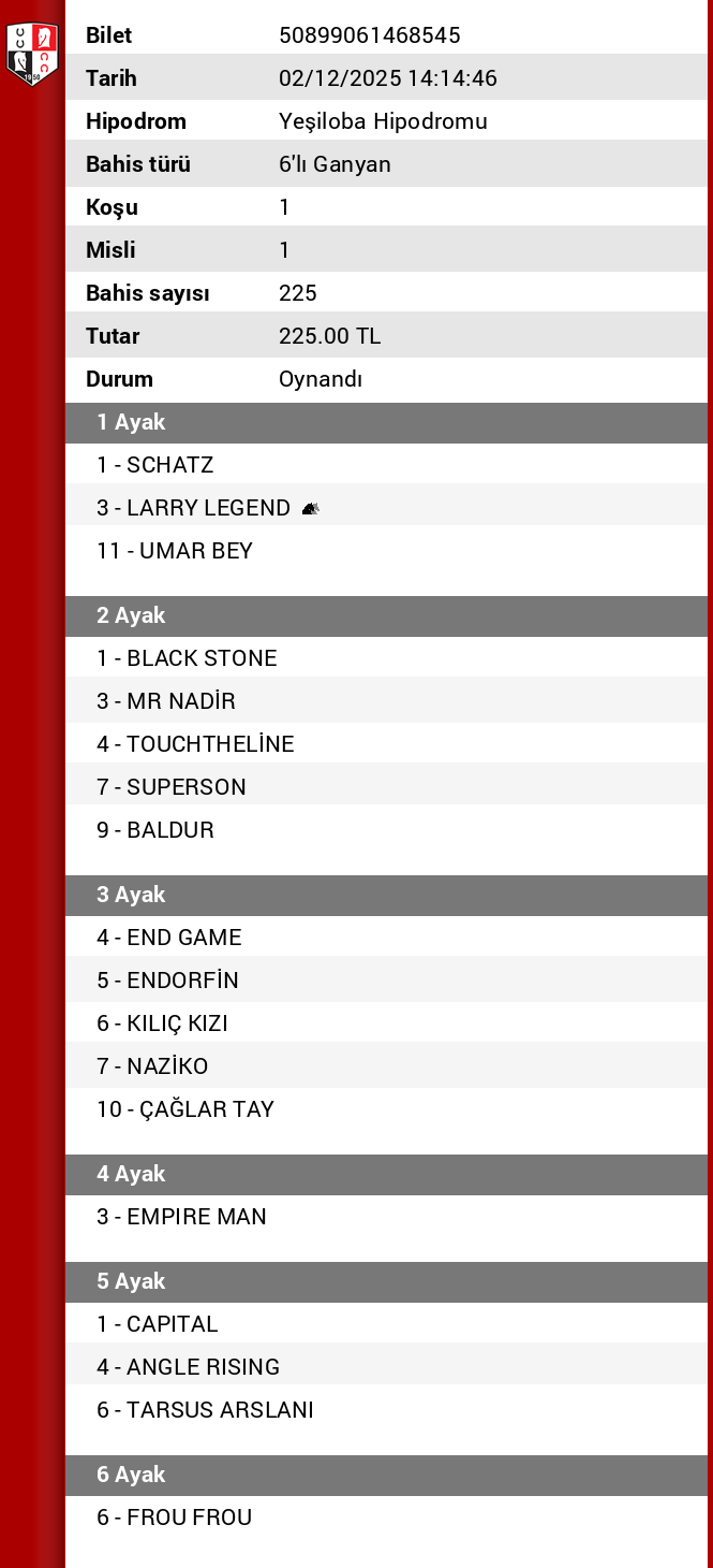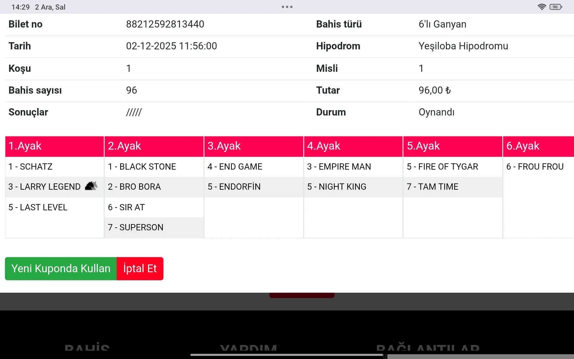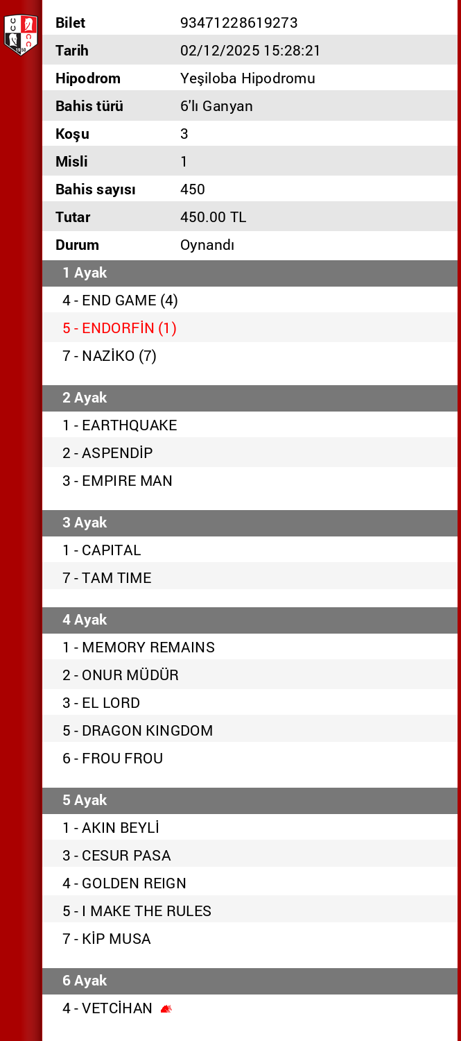 Bilet no 29975501019802 Bahis türü 6’lı Ganyan
