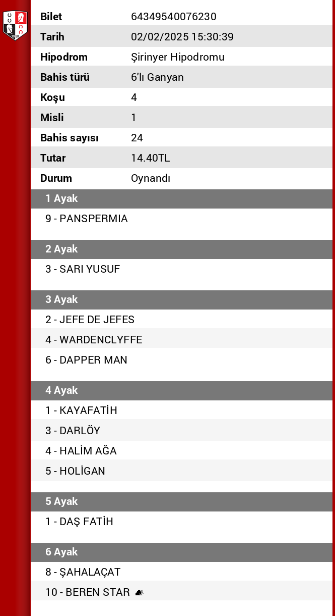Bilet no 28786865854297 Bahis türü 6’lı Ganyan