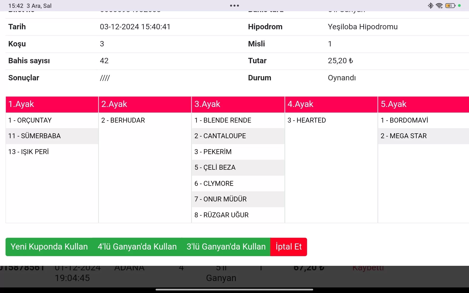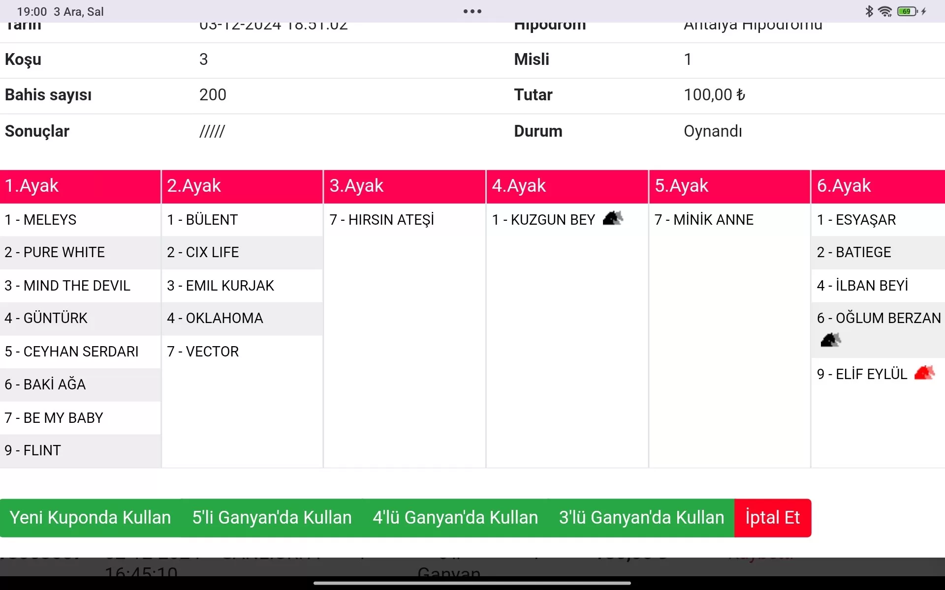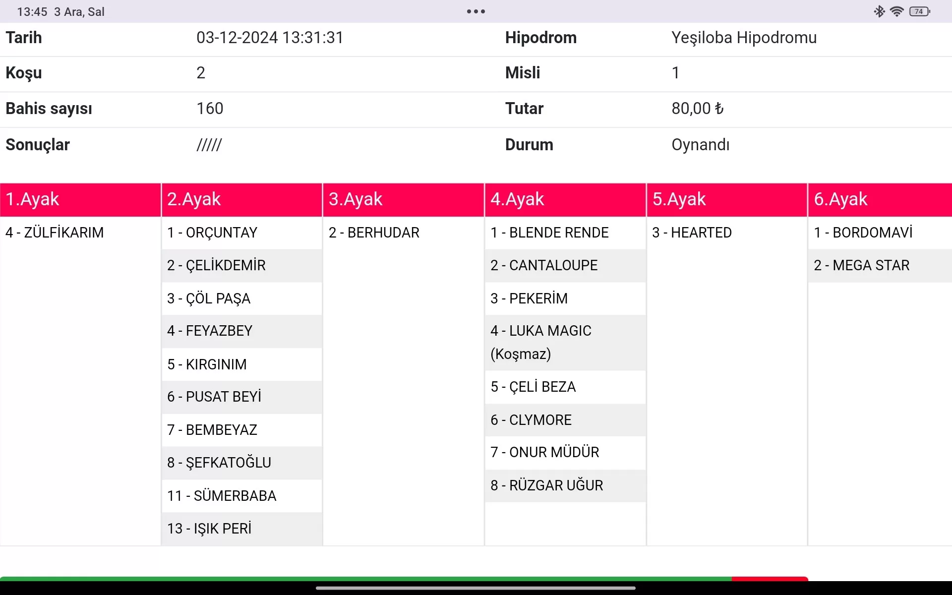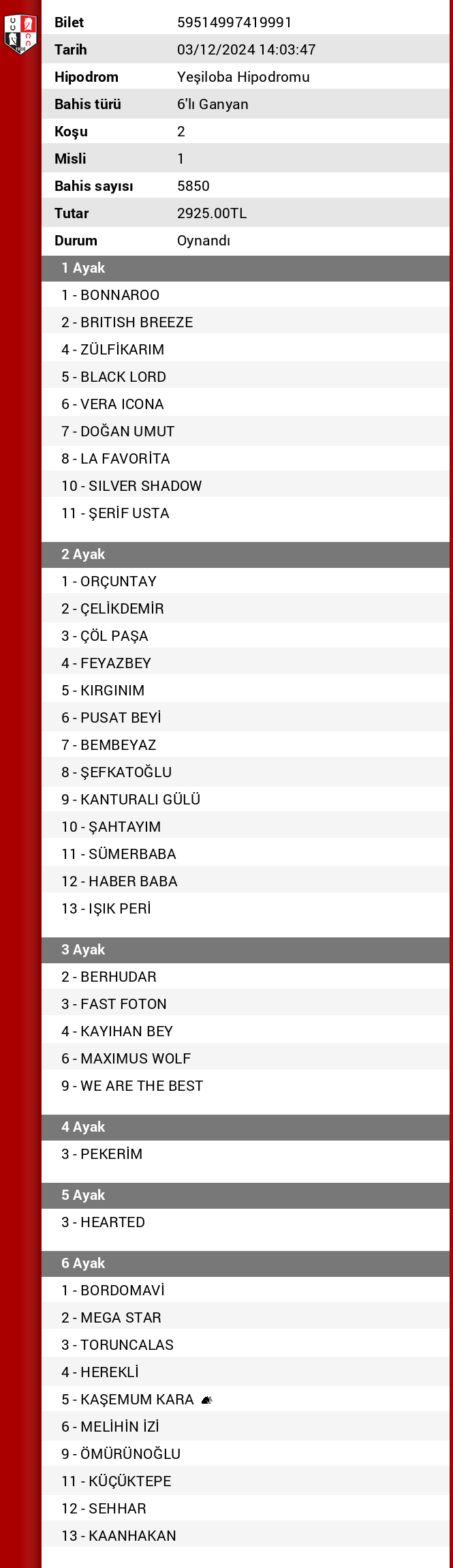 6.KOŞU: Koştuğu üç yarışta oldukça başarılı olan 3-HEARTED özellikle son koşusunda bu mesafede 1,21’97 derecesi ile kazanırken aynı gün yaşça büyük safkanların start aldığı 15 handikaplı koşudan daha iyi derece çıkarmıştı.Hatta yine aynı gün koşulan 1400 metrelik KV8 koşuda Altınsima,Sweet Sacrıfıce,Bold Streak gibi önemli safkanların 1,28-1,29 içinde yar alan derecelerine göre daha iyi görünüyordu.Bu şartlarda da gönlüm bu safkanın yanına at yazmaya el vermedi..Eğer o günkü performansına yakın bir performans gösterirse kazanmaya oldukça yakın gözüküp benim de banko tercihim olacak.