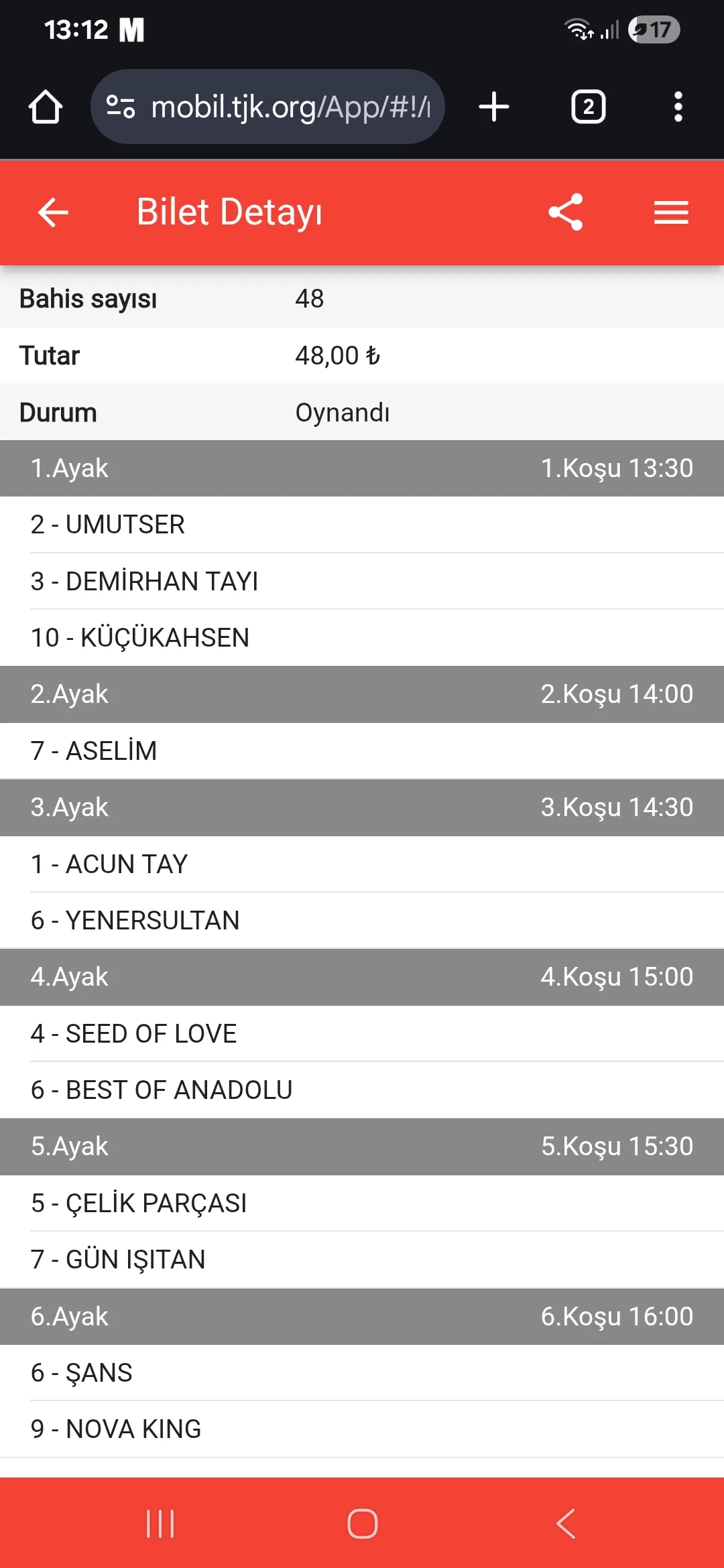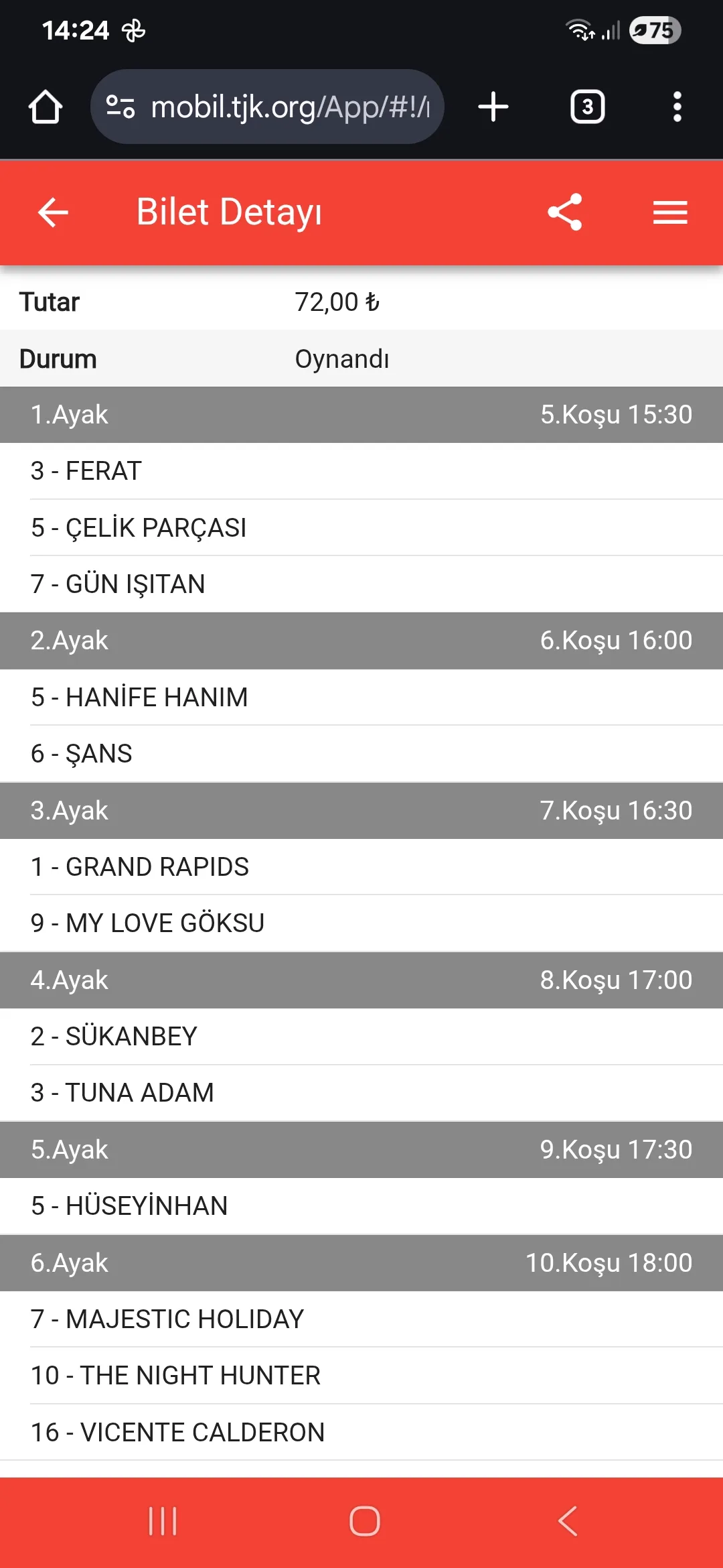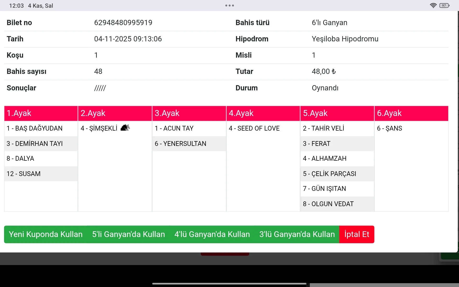 Bilet no 48856751507478 Bahis türü 6’lı Ganyan