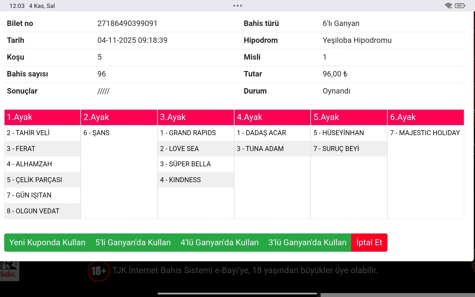 Bilet no 26078796616936 Bahis türü 6’lı Ganyan