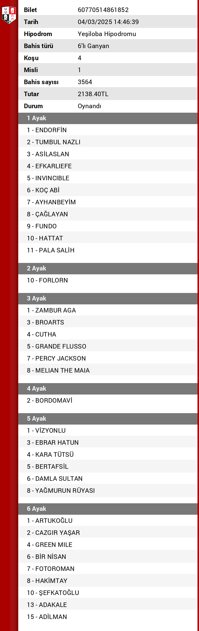 Bilet no 18146677594072 Bahis türü 6’lı Ganyan
