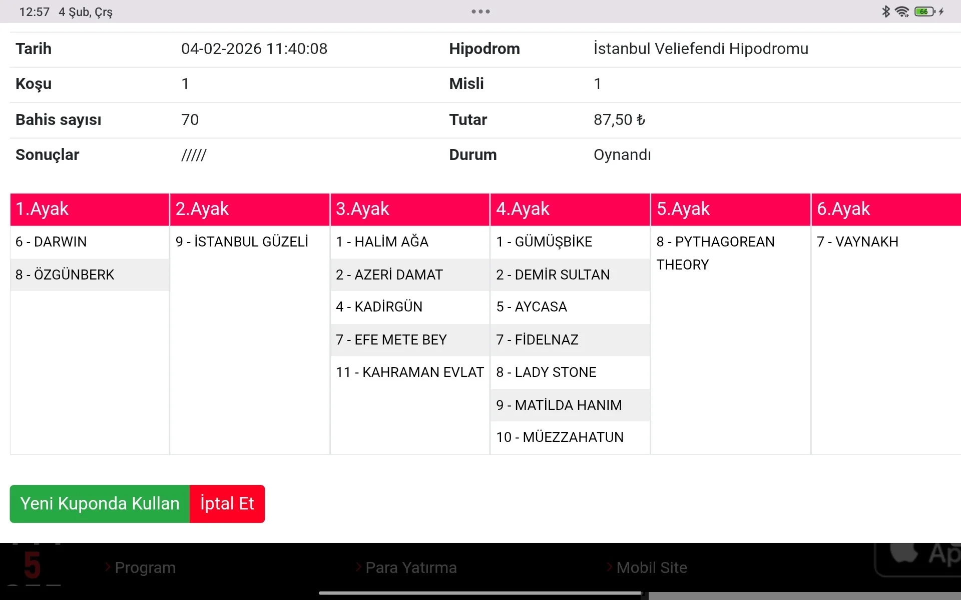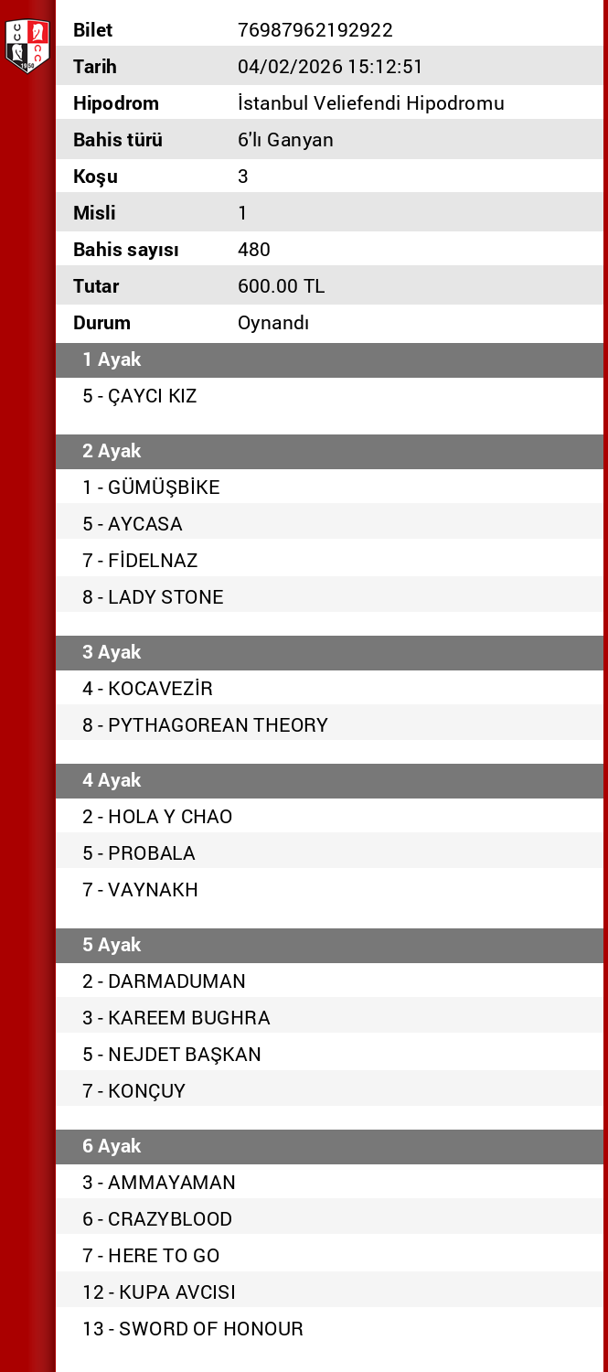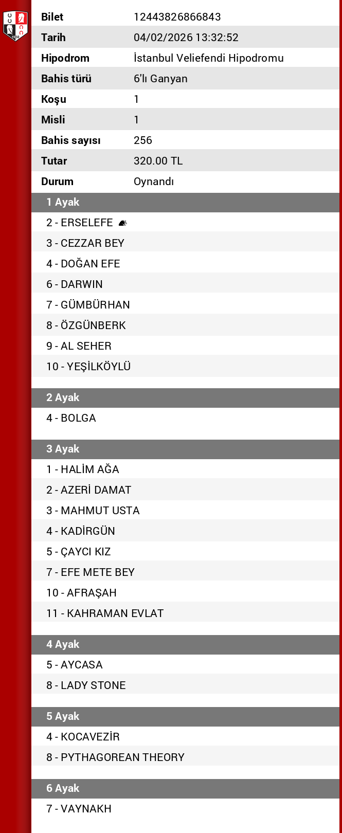Bilet no 95699733131691 Bahis türü 6’lı Ganyan