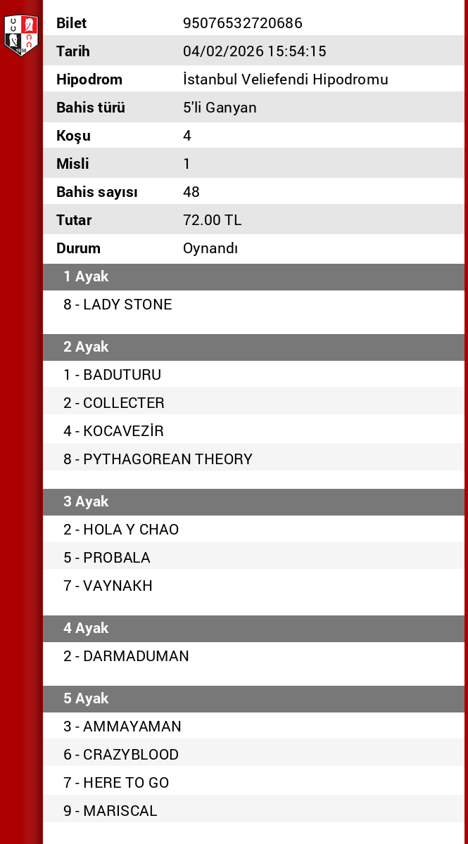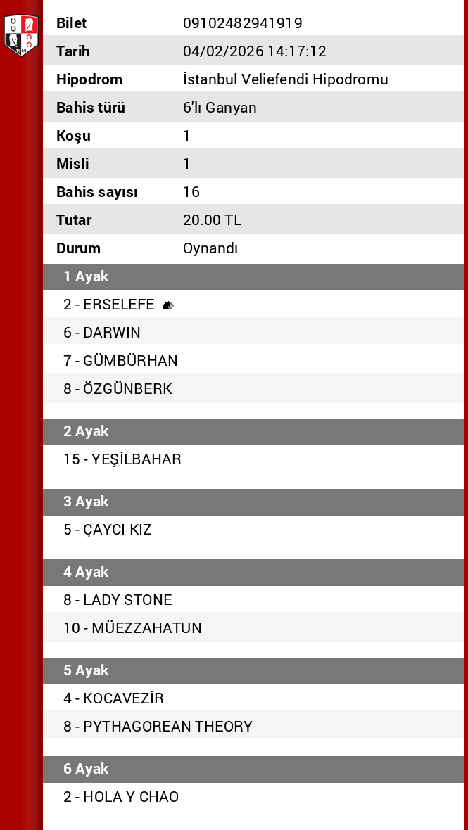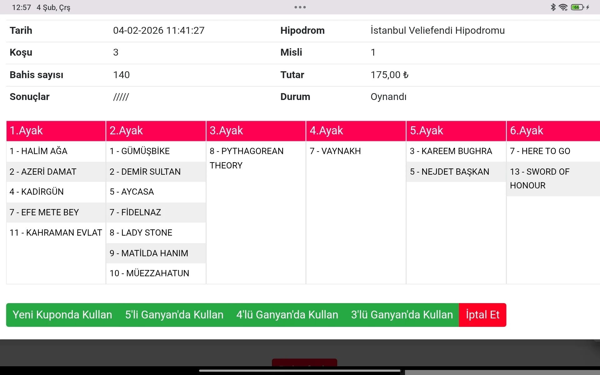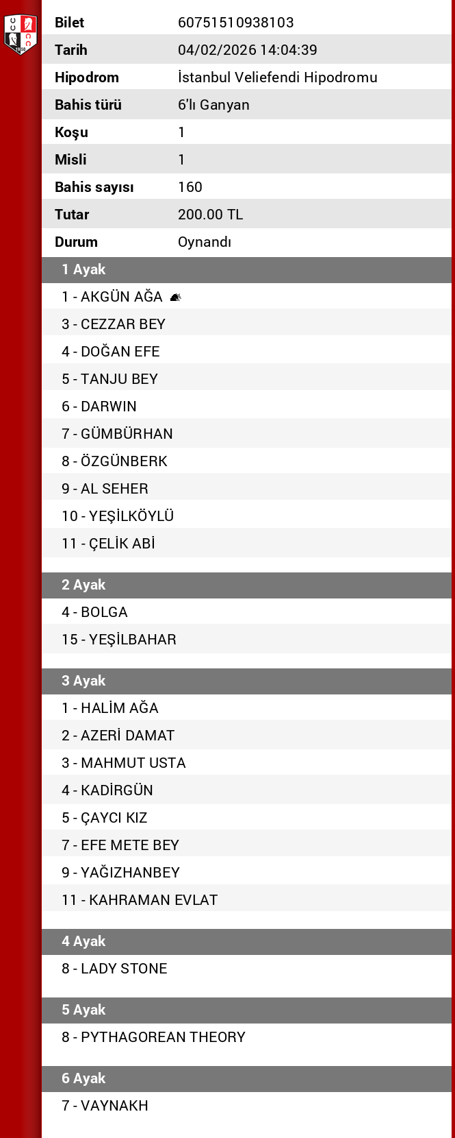 Bilet no 95699733131691 Bahis türü 6’lı Ganyan