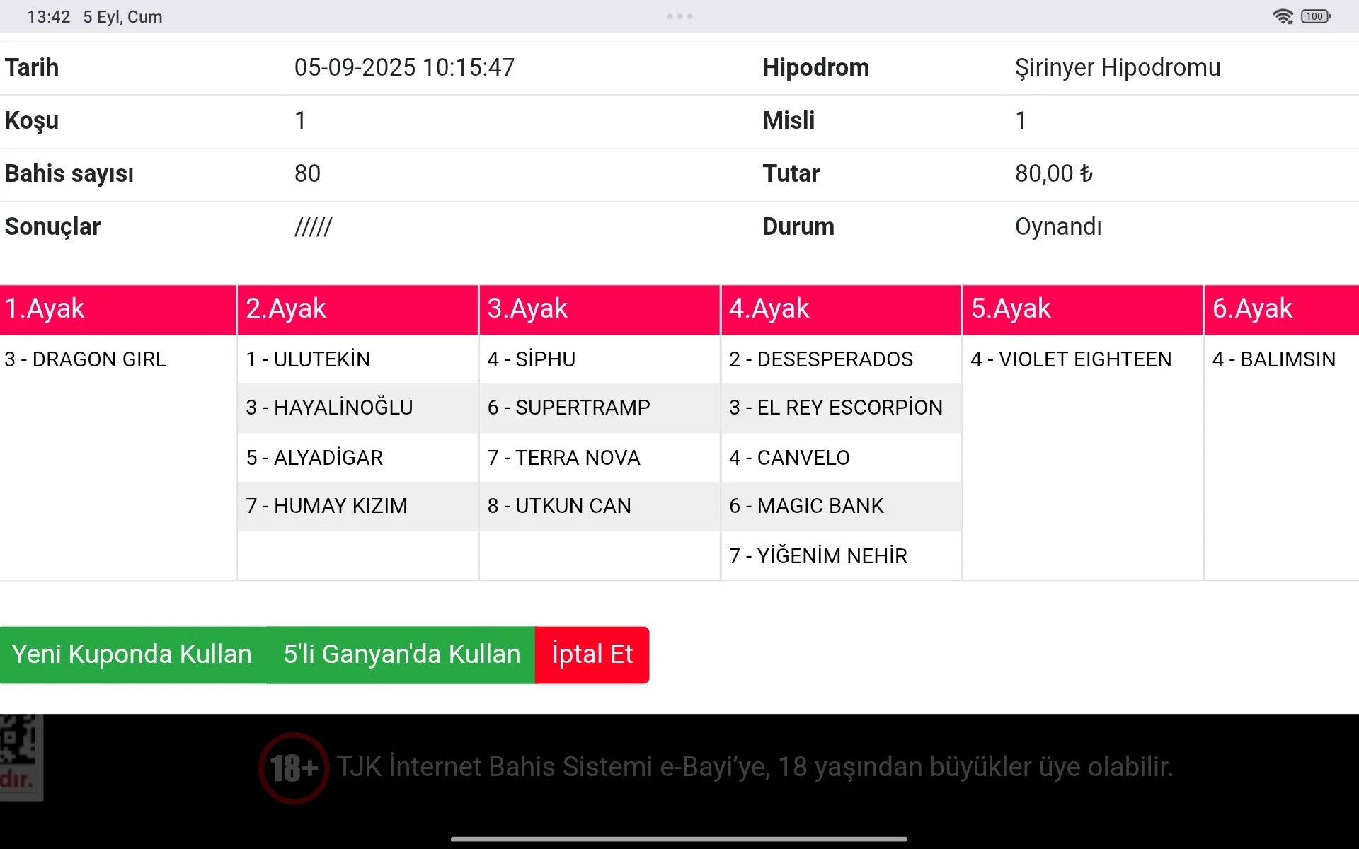 Bahis sayısı 40 Tutar 48,00 ₺