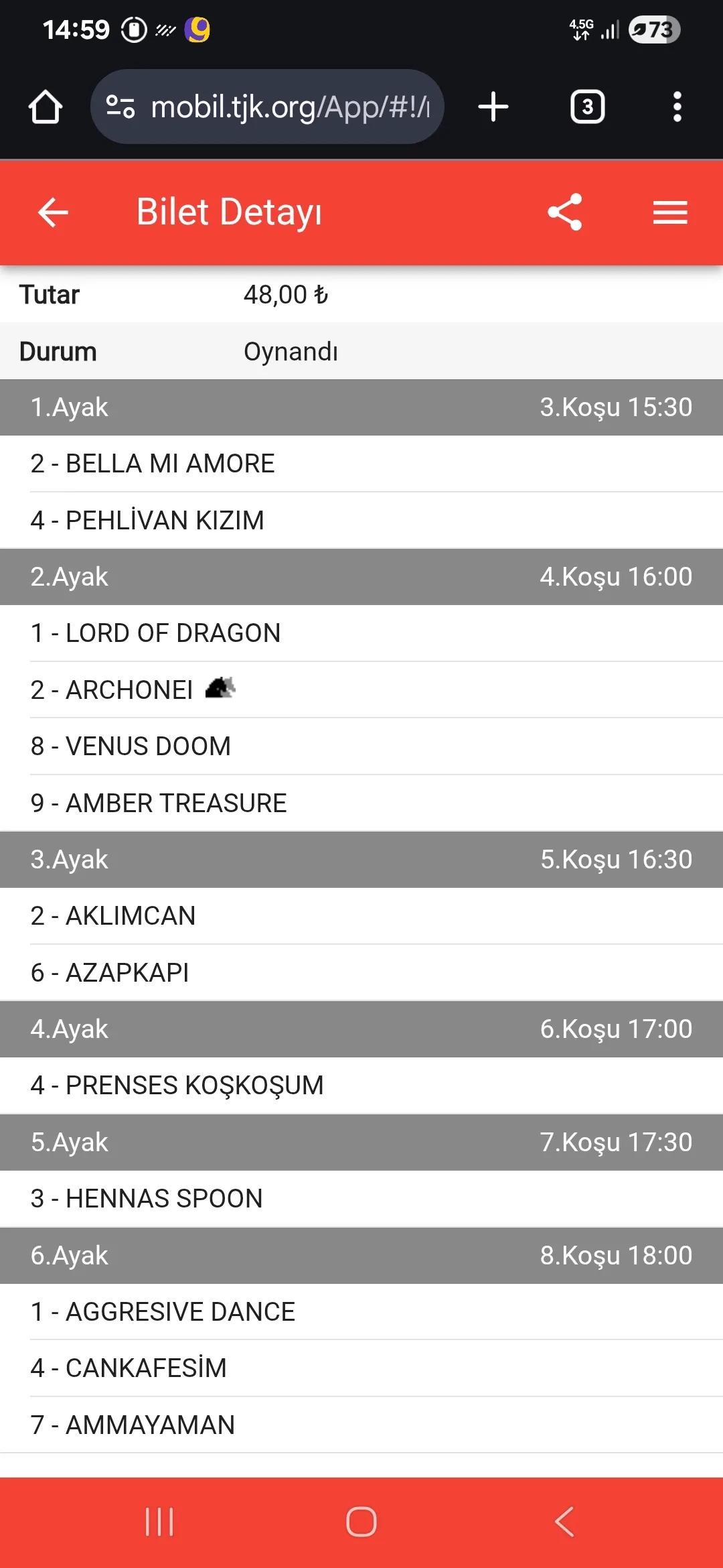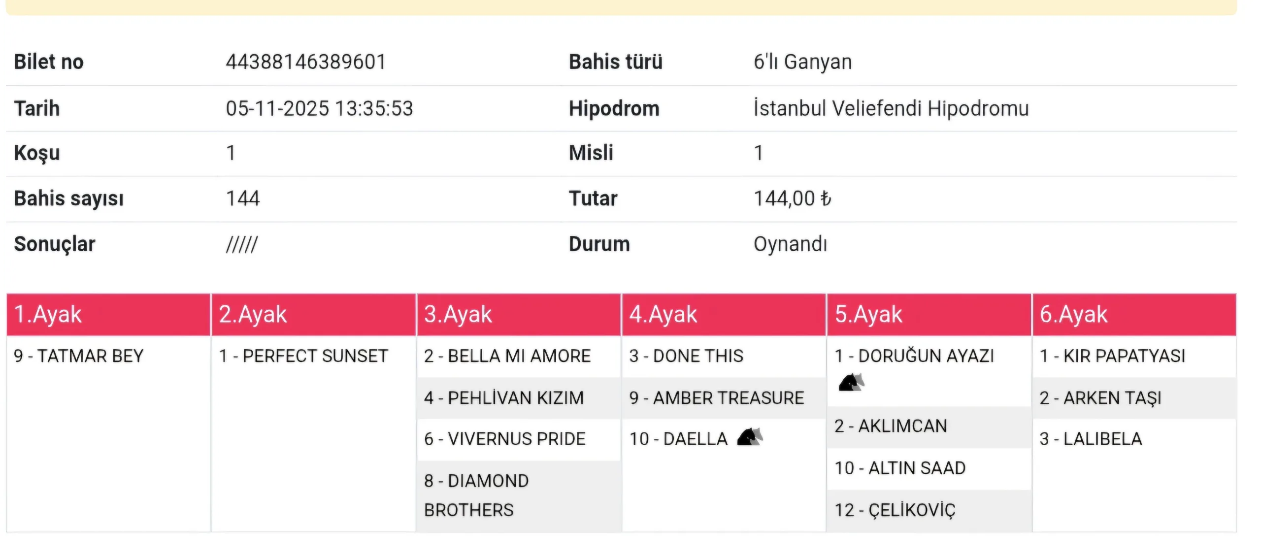 Bilet no 88503677938710 Bahis türü 6’lı Ganyan