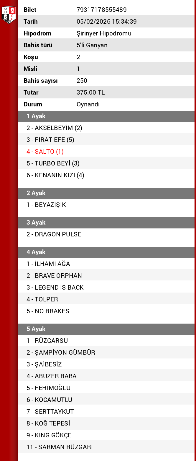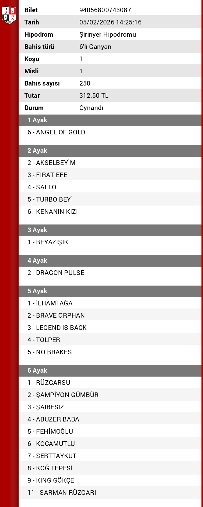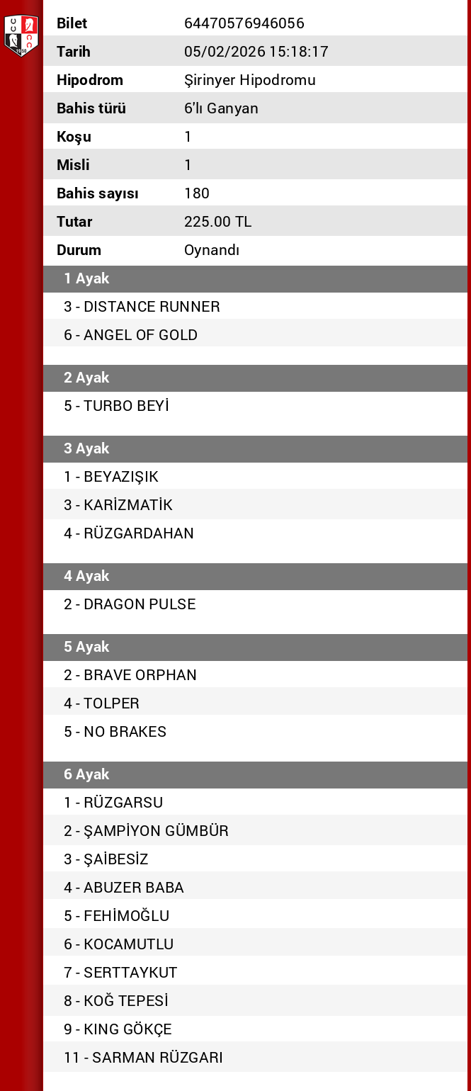Bilet no 48711022432168 Bahis türü 6’lı Ganyan