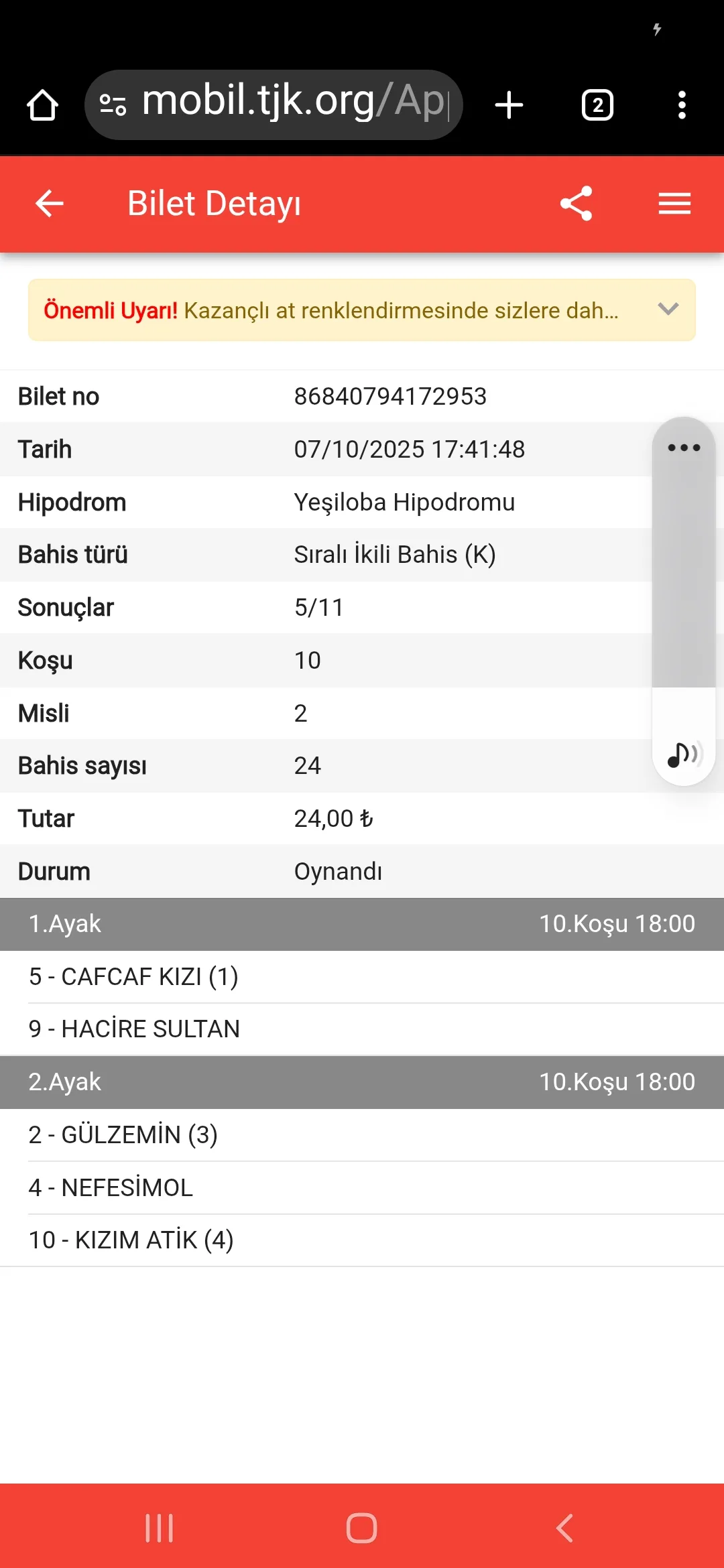 Bilet no 95400298737203 Bahis türü 6’lı Ganyan