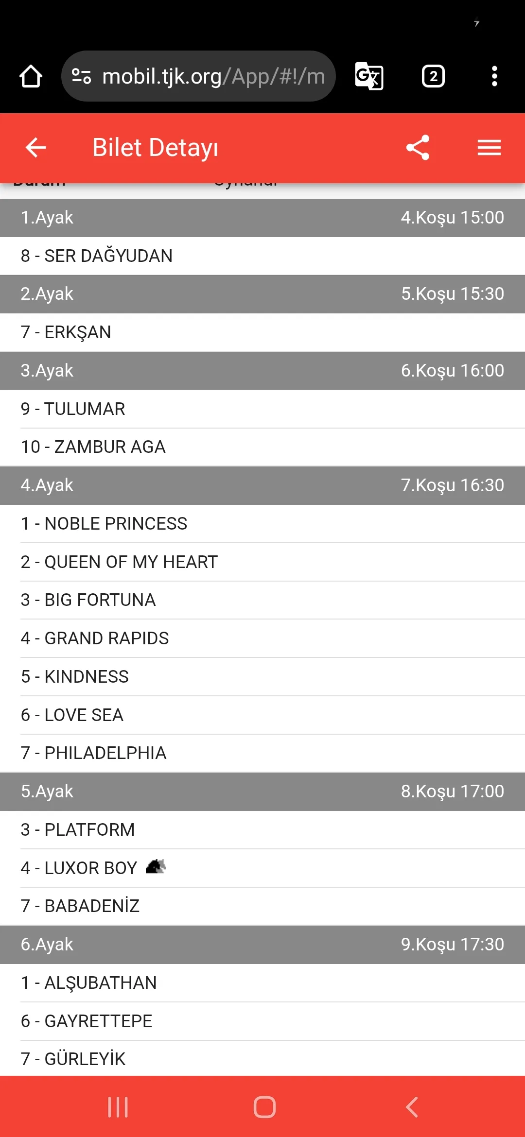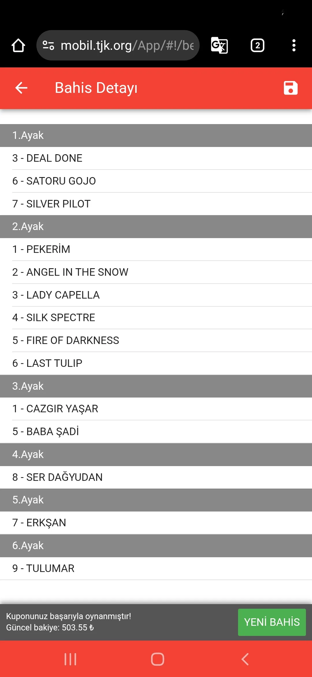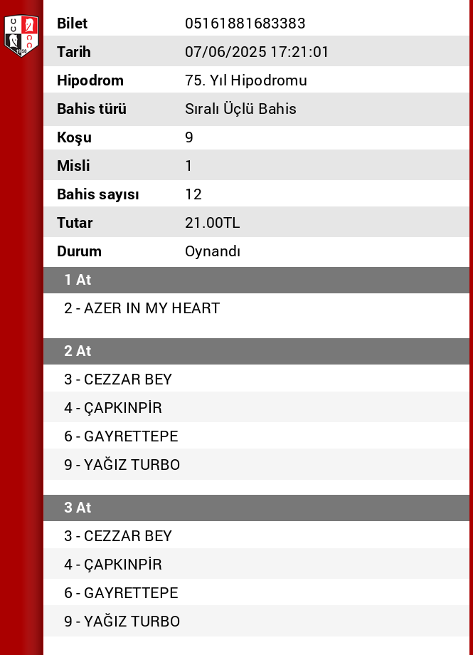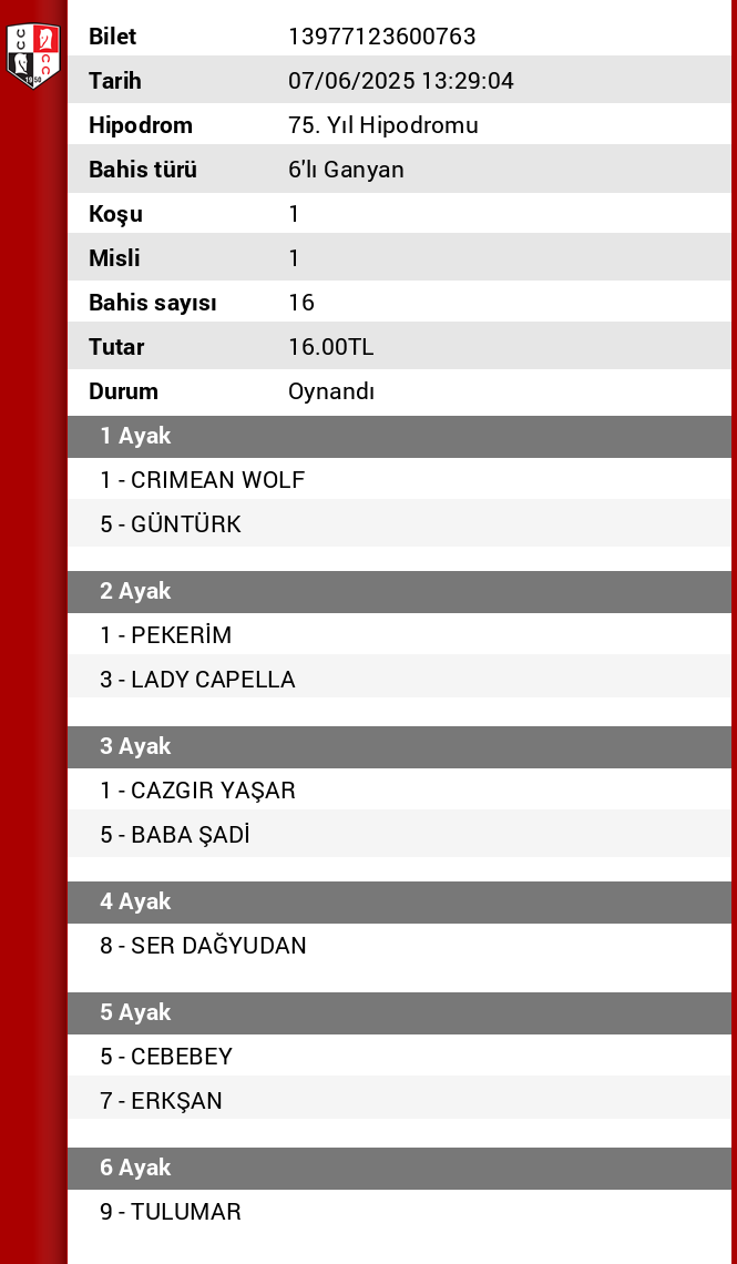 Bilet no 09923472969544 Bahis türü 6’lı Ganyan