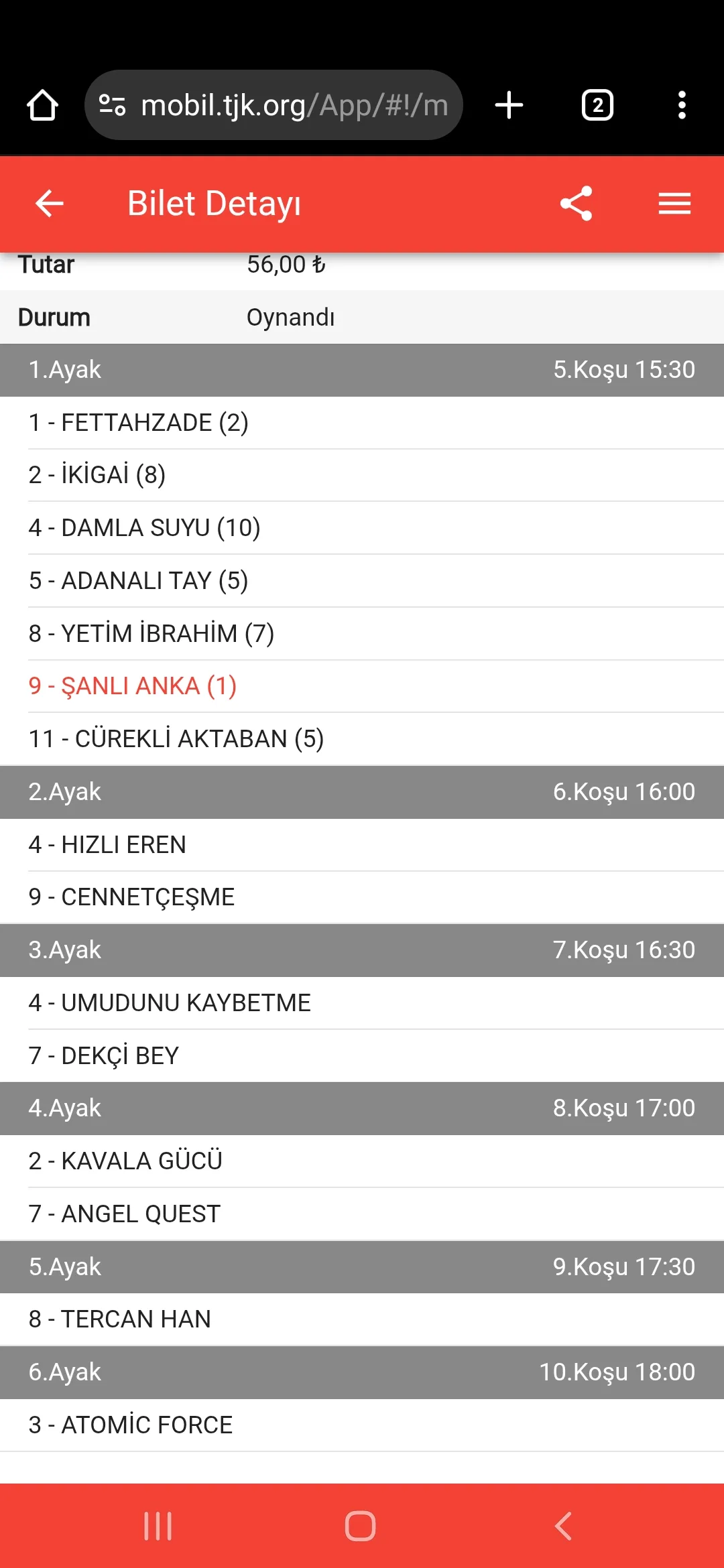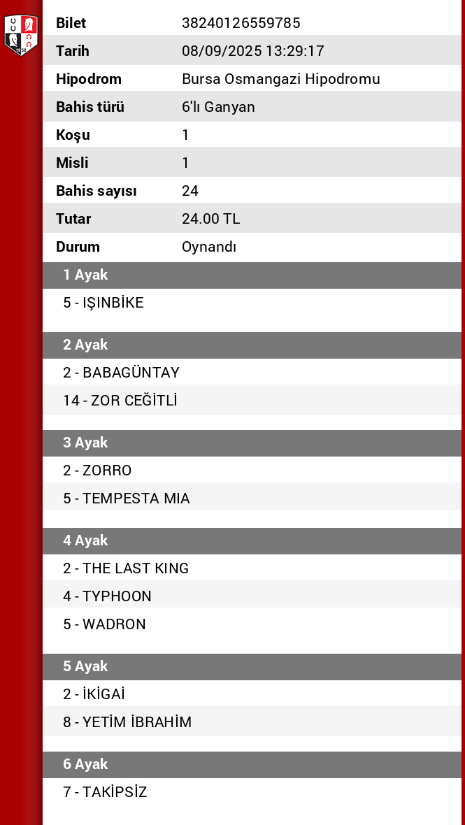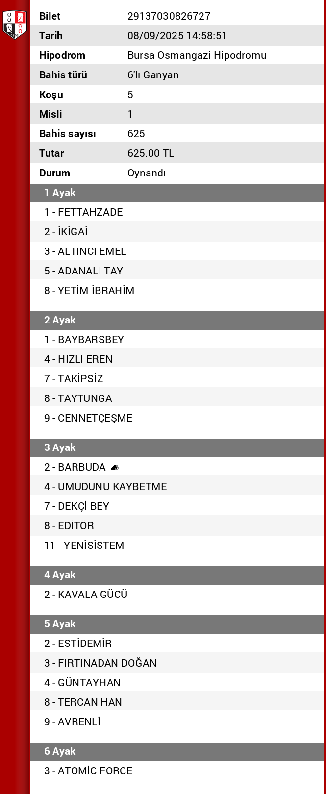 Bilet no 17517018367409 Bahis türü 6’lı Ganyan
