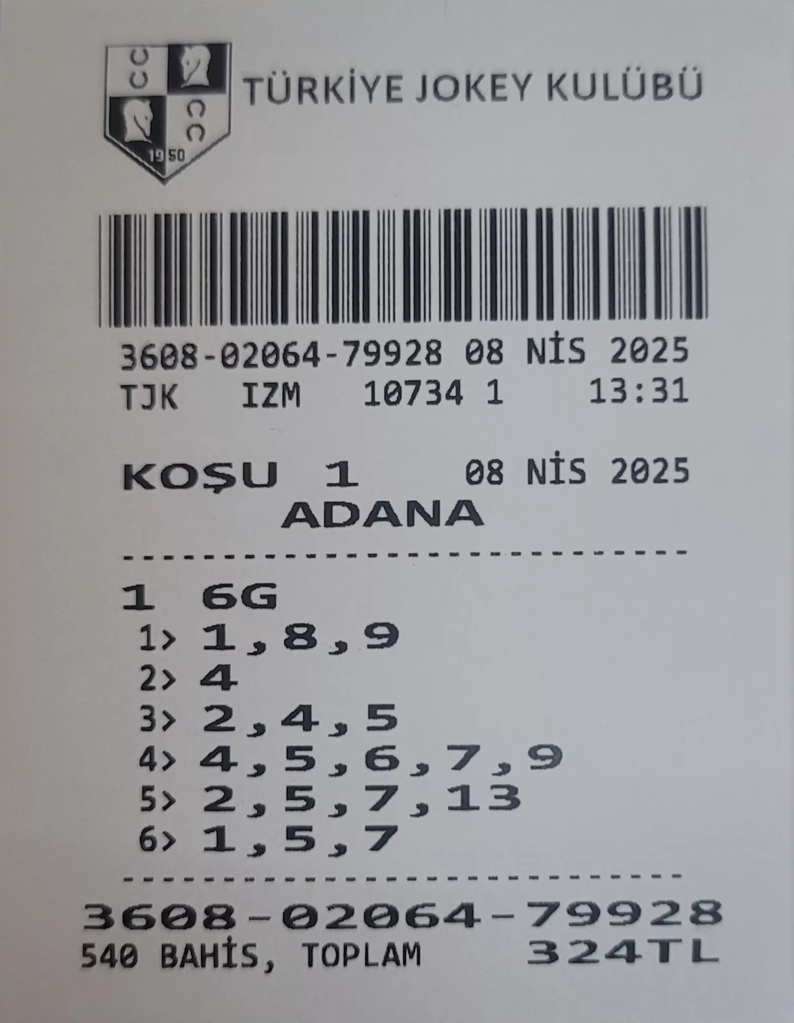 Bilet no 43053586300625 Bahis türü 6’lı Ganyan