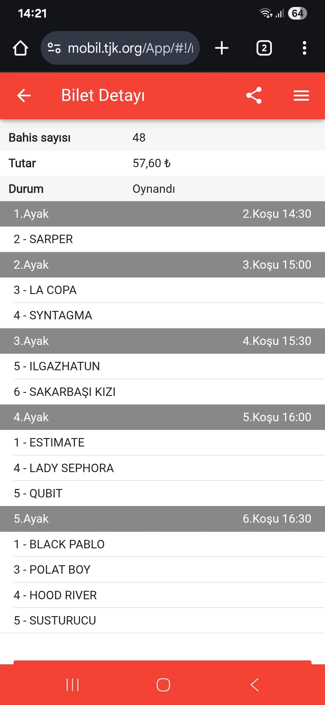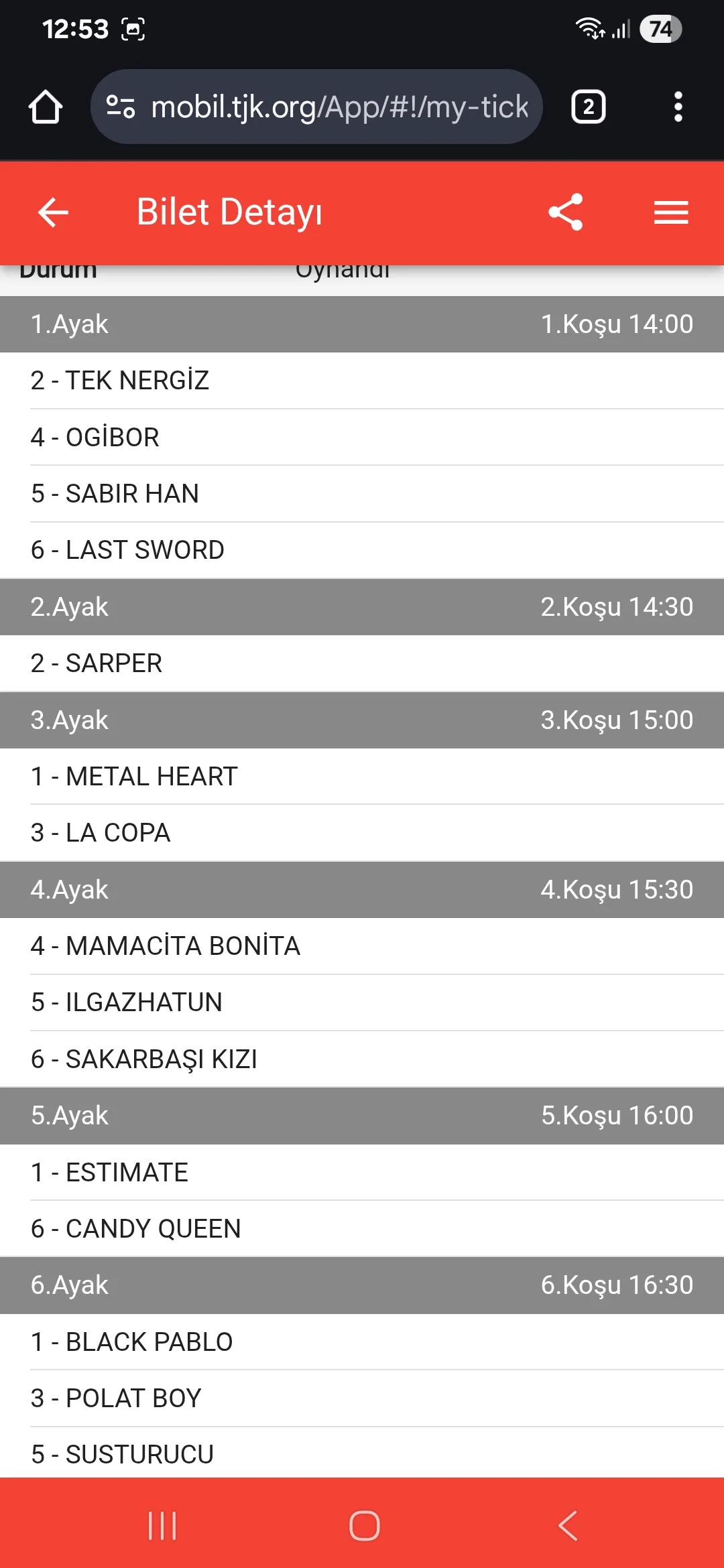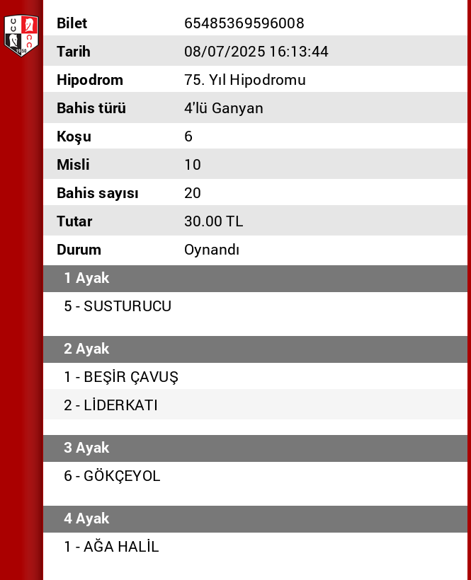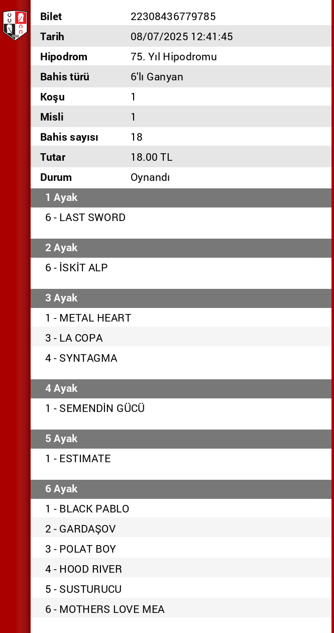 Bilet no 99821022109661 Bahis türü 6’lı Ganyan