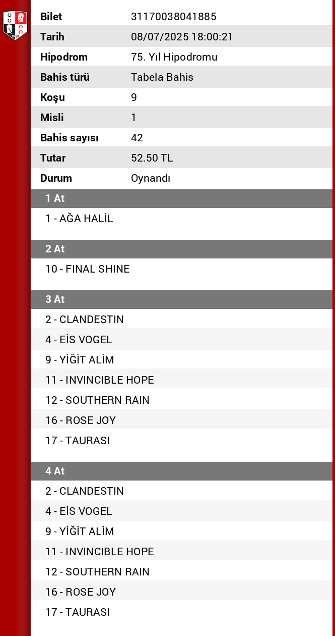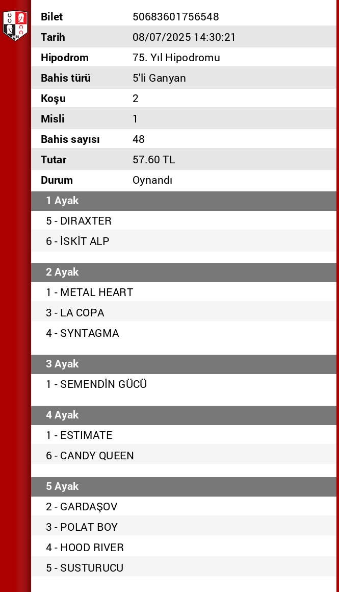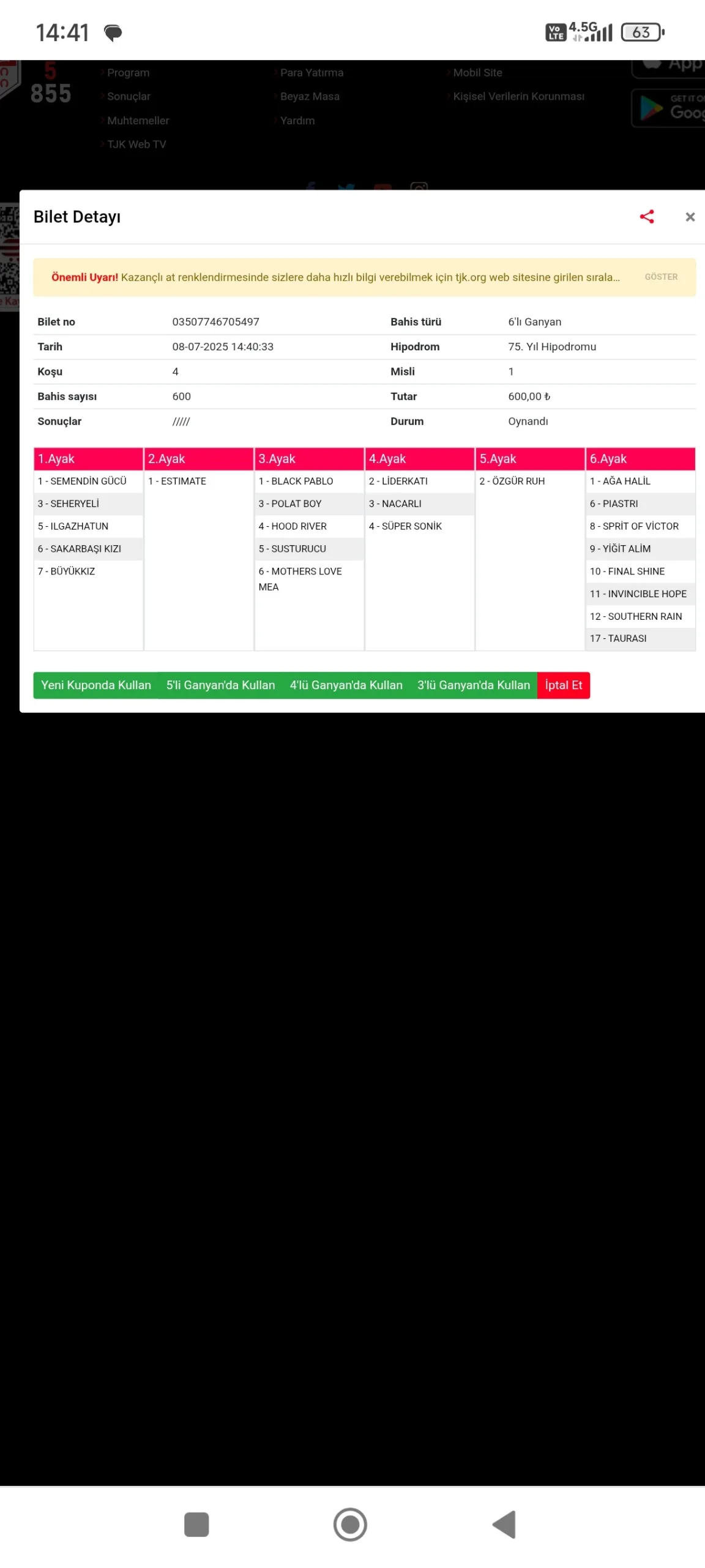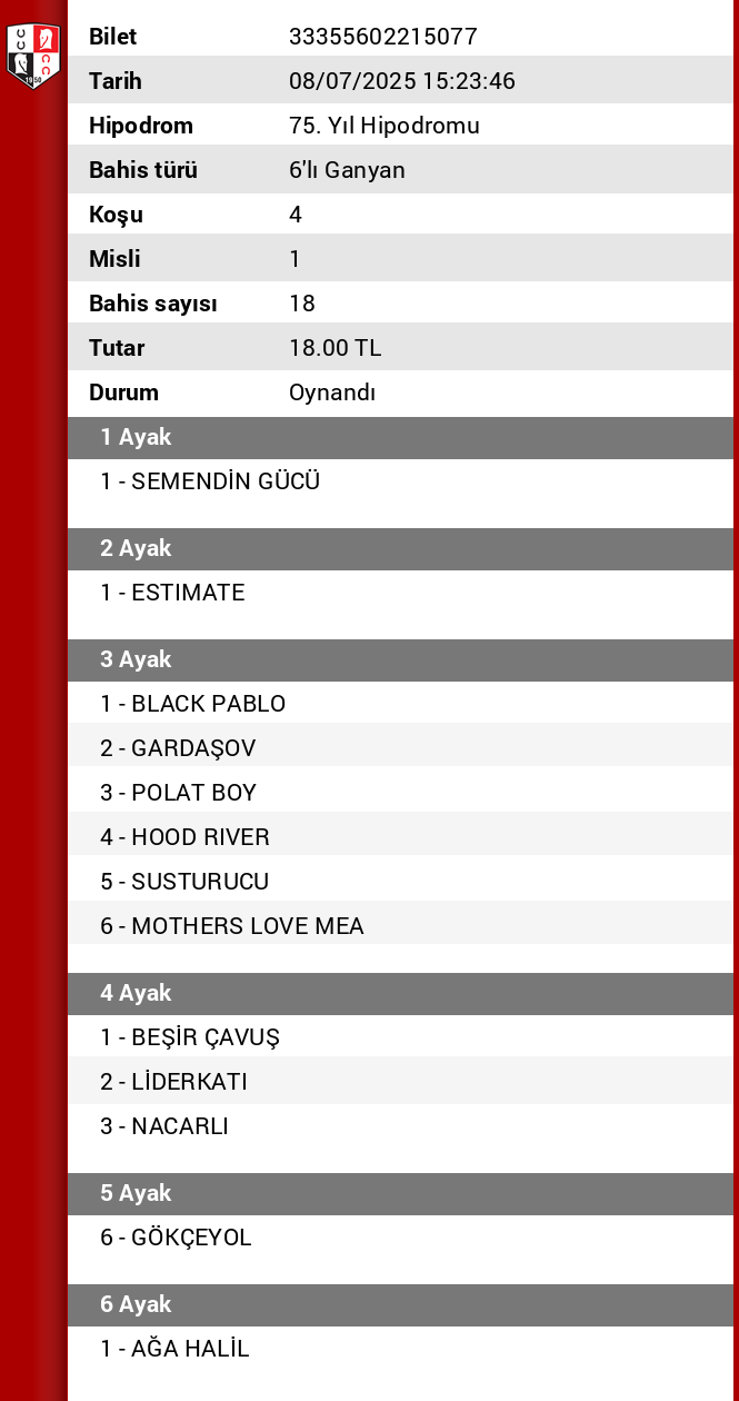 Bilet no 99821022109661 Bahis türü 6’lı Ganyan