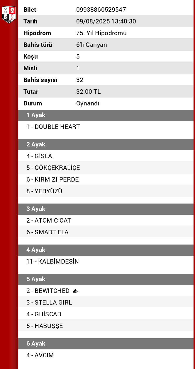 Bilet no 29520836256280 Bahis türü 6’lı Ganyan