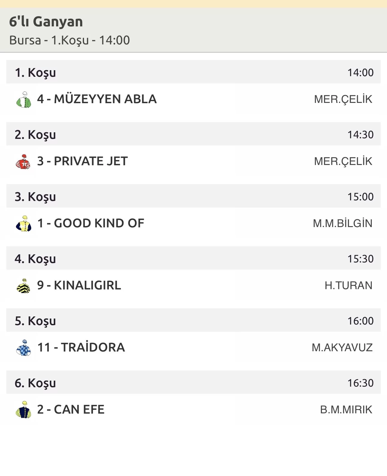 6.KOŞU: 1-KAYI BEYİ güçlü sprinti ile favorim…2-CAN EFE ve 3-MY STAR rakip olarak gördüğüm safkanlar…