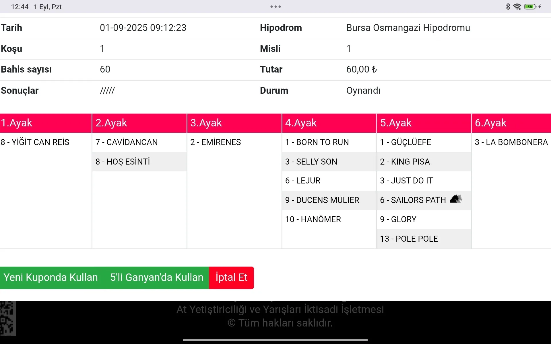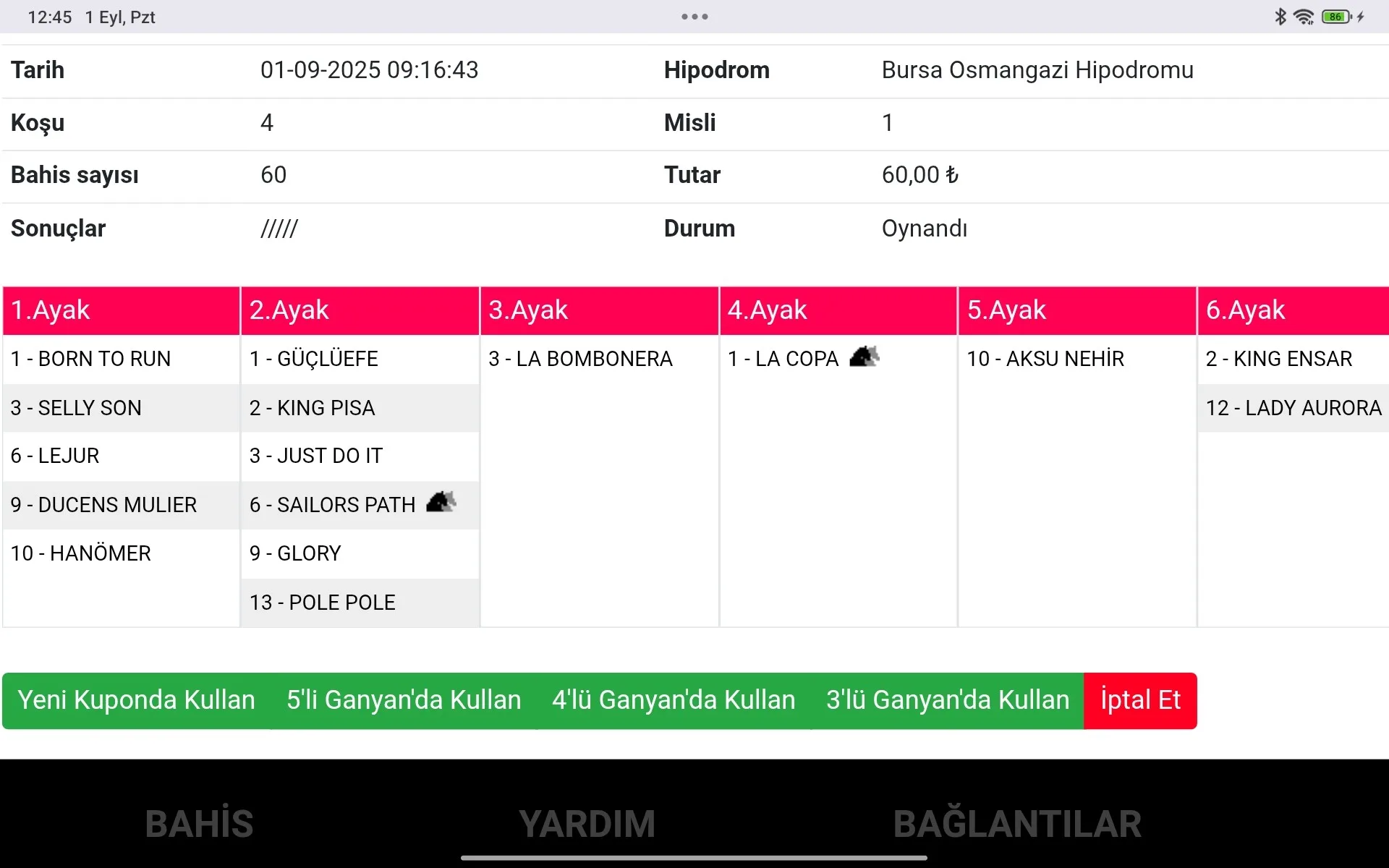 Bilet no 49162274047662 Bahis türü 5’li Ganyan