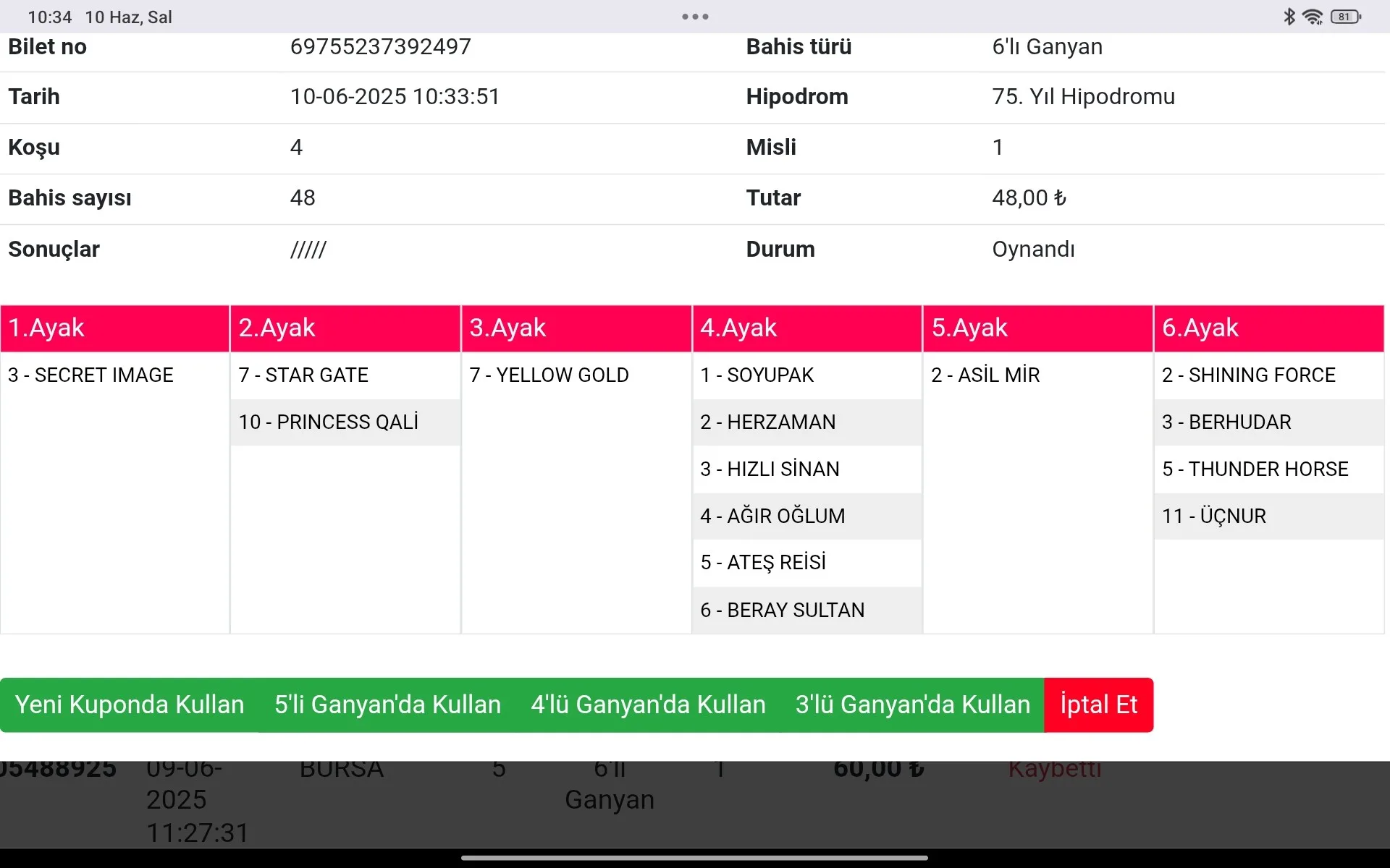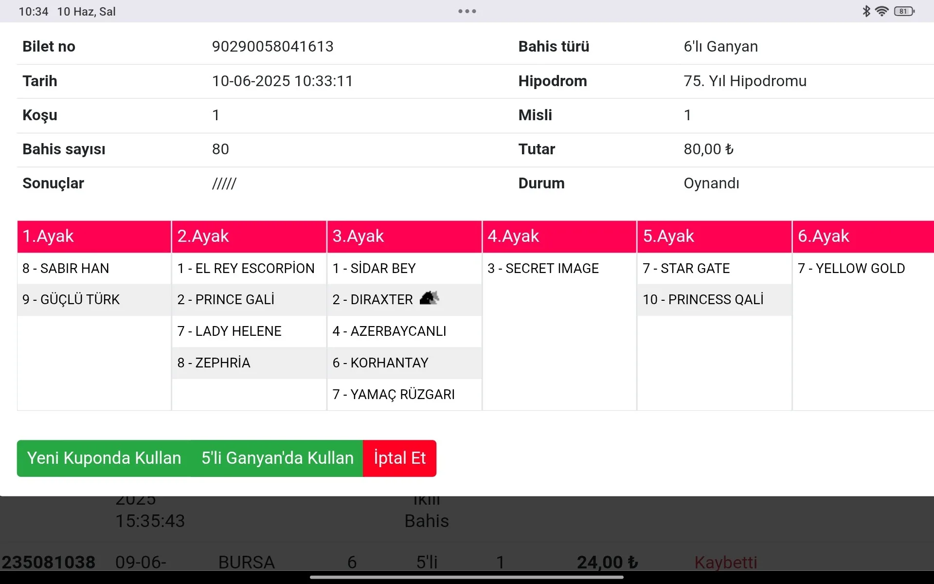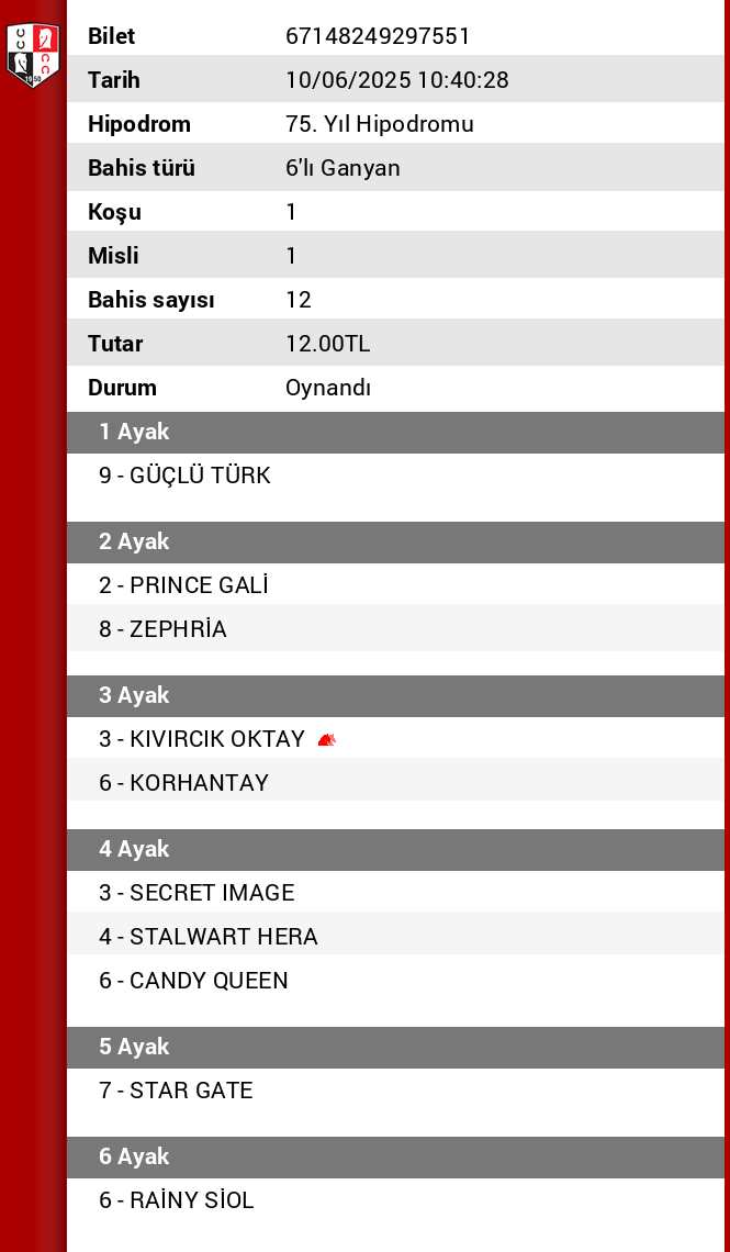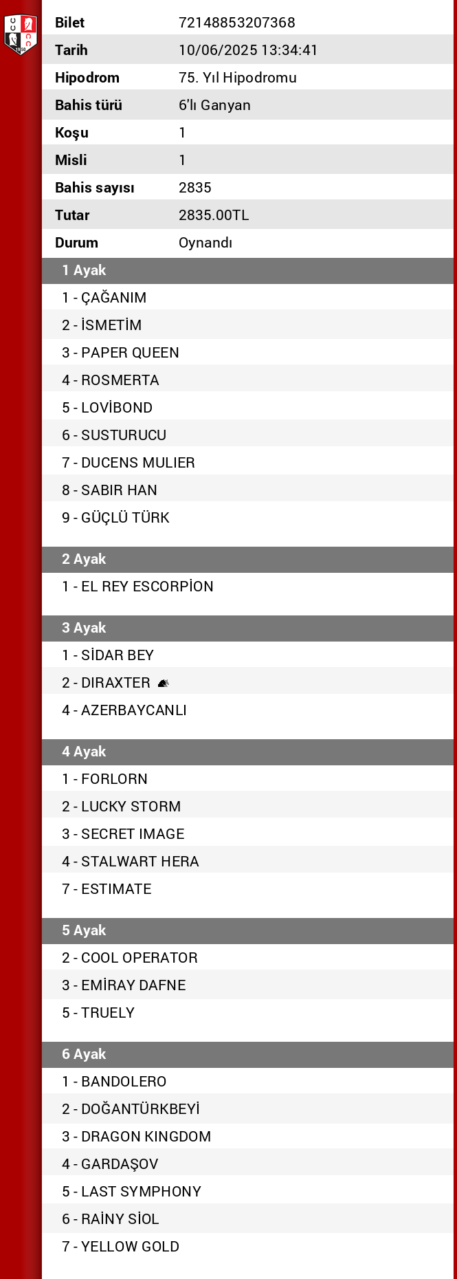 Bilet no 40306753098516 Bahis türü 6’lı Ganyan
