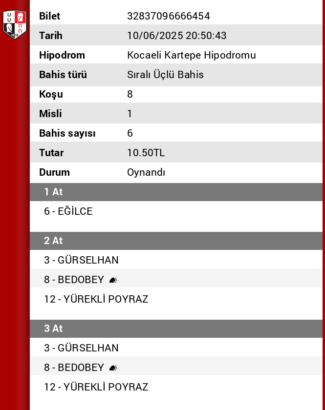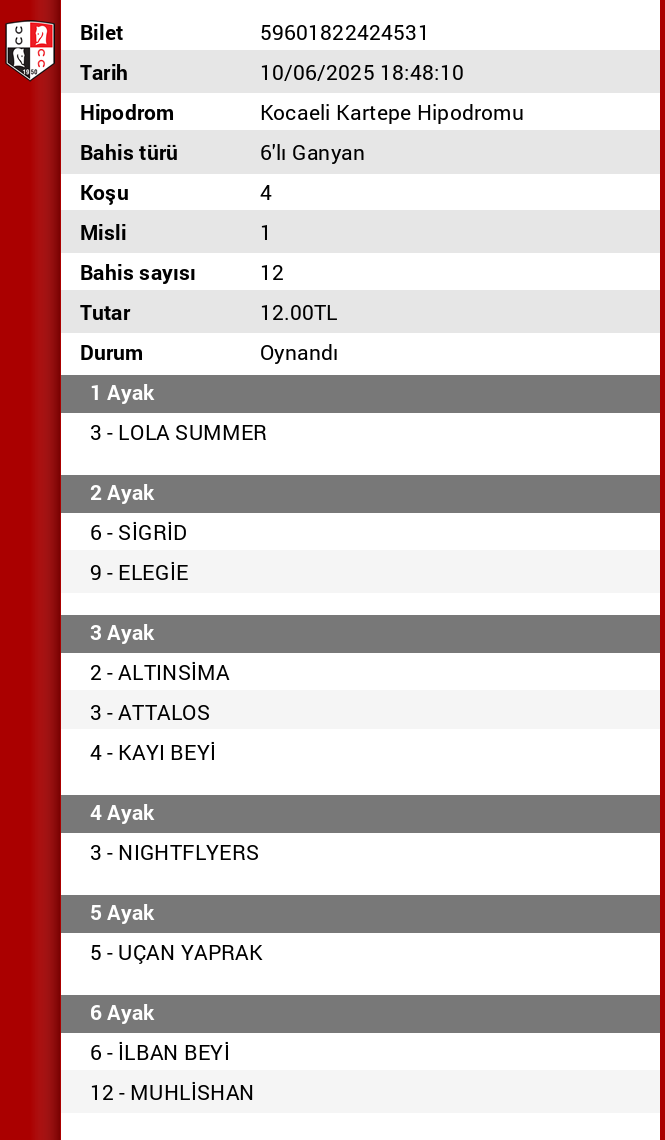 Bahis sayısı 12 Tutar 12,00 ₺