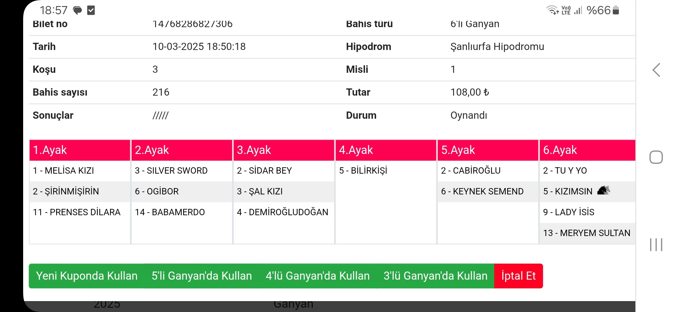 dumrul zor geçilir, 5. ayak 3 bizim at kaçarak bitirmeye çalışacak, rakip 2 cabiroğlu ikilisi öyle biter son ayak 1 habbuşe zor geçilir rakip 8, günü kurtar