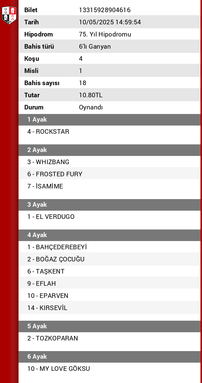 4. KOŞU: 6 ÖZAKIN gruptan üstün ama agf geri çıkmış ilginç 4 ROCKSTAR 5 IRMAK SU 7 PAMUKÇU 11 LE PATRON 10 GÜRAYHAN dikkat