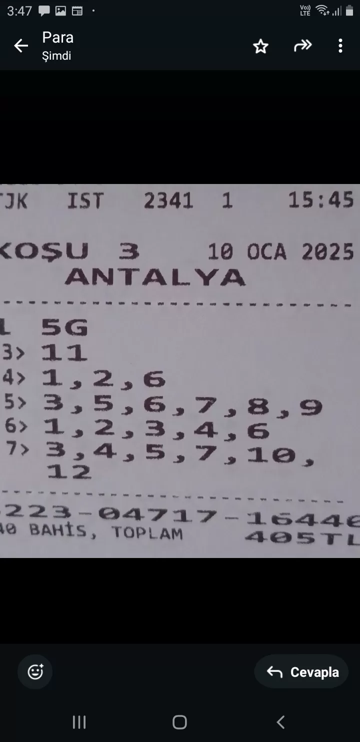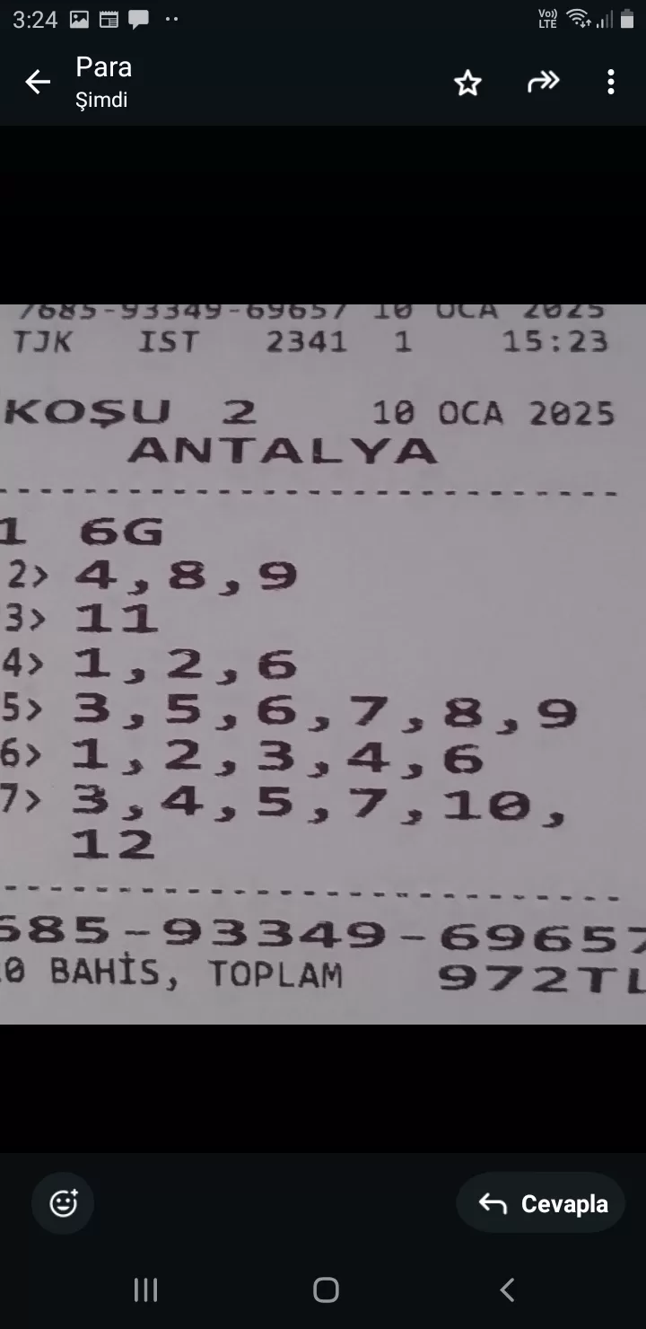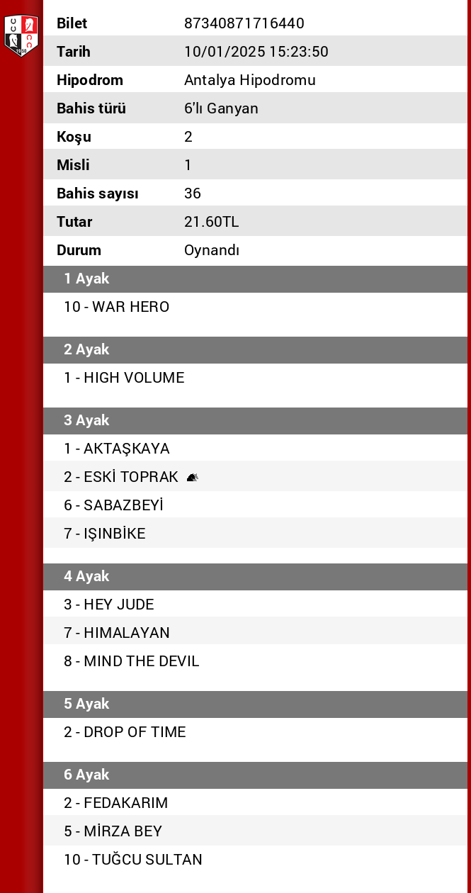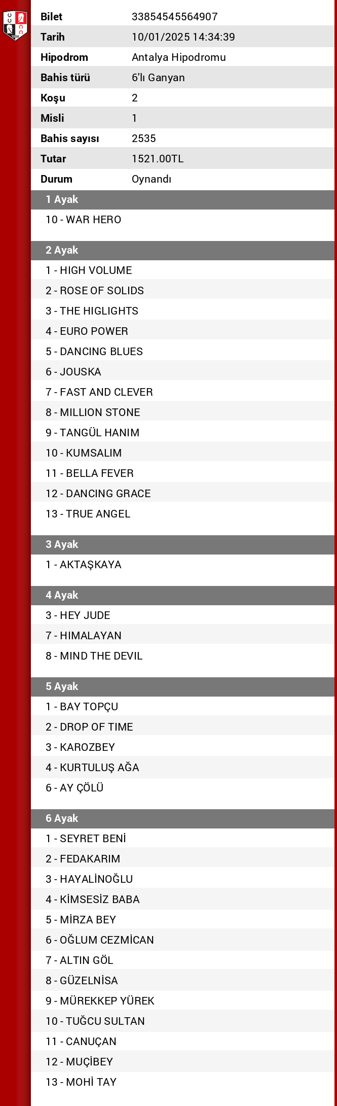 Bilet no 15687692333843 Bahis türü 6’lı Ganyan