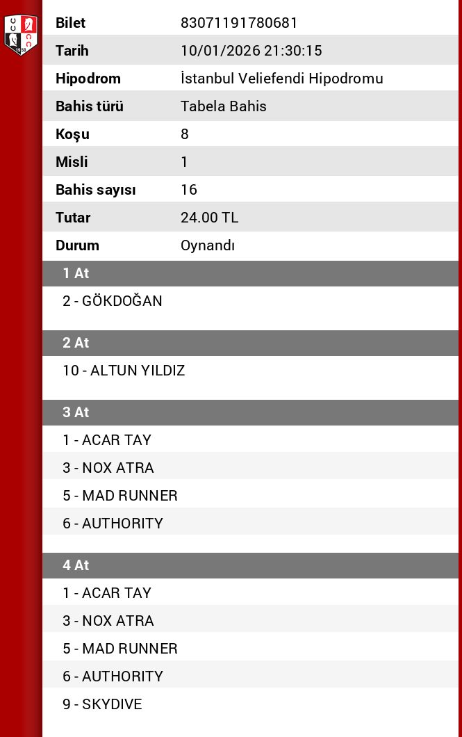 8.KOŞU : 6 AUTHORITY mesafe pist uygun sevdiği yer idmanında hazır gibi BANKO