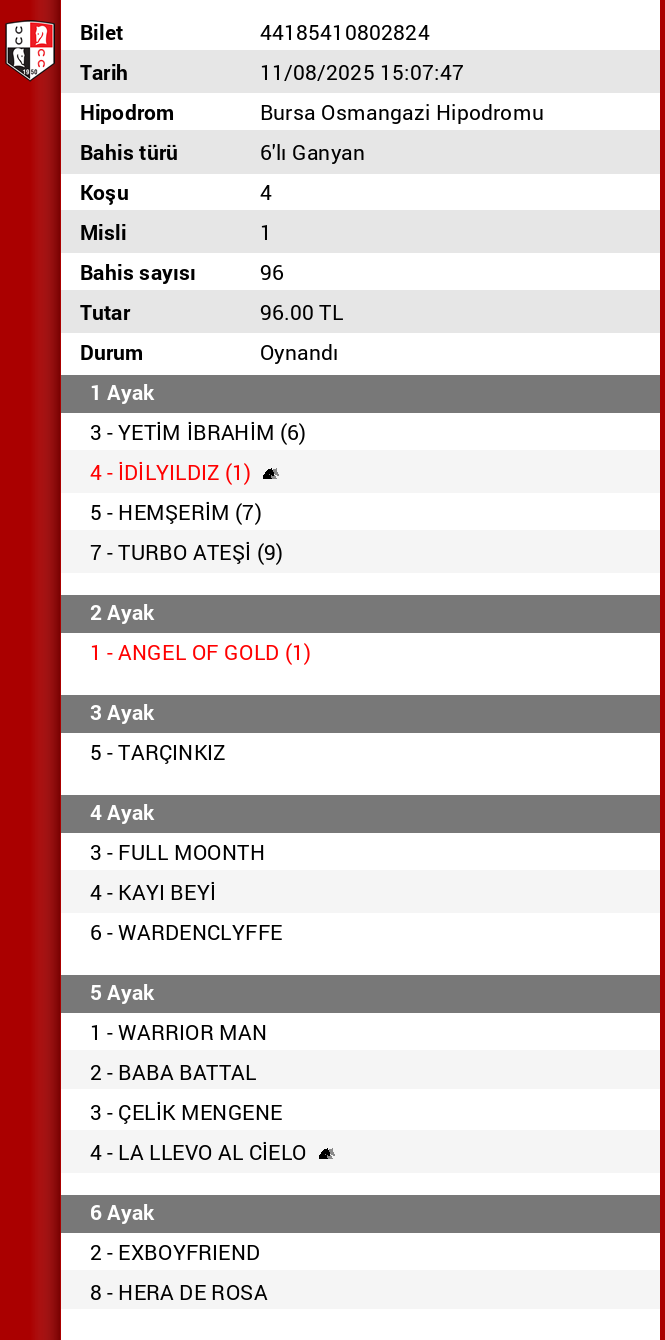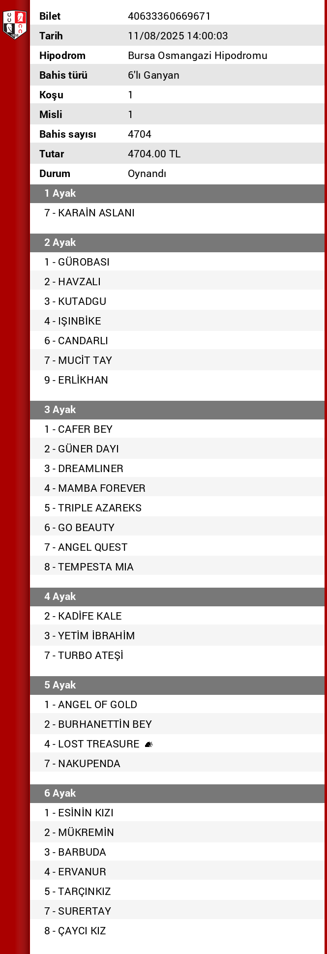 Bilet no 46529631804142 Bahis türü 6’lı Ganyan
