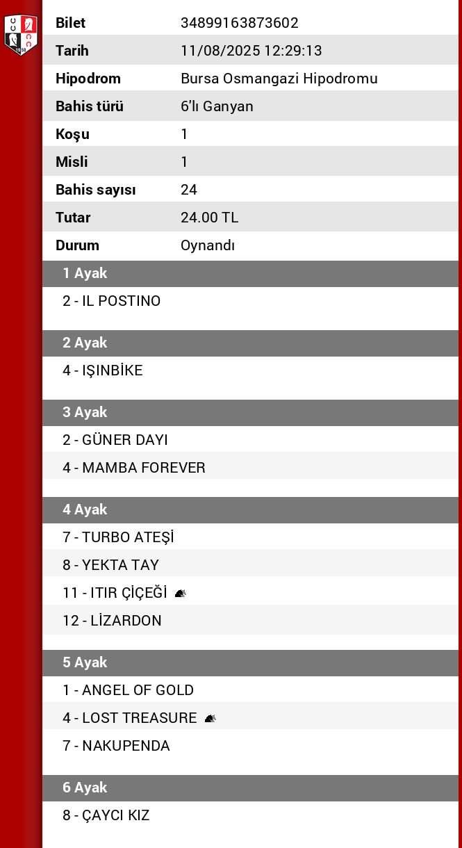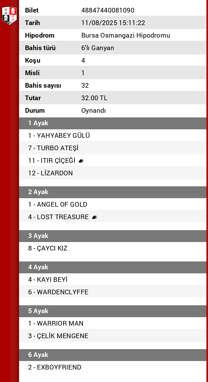 Bilet no 48552757421187 Bahis türü 6’lı Ganyan