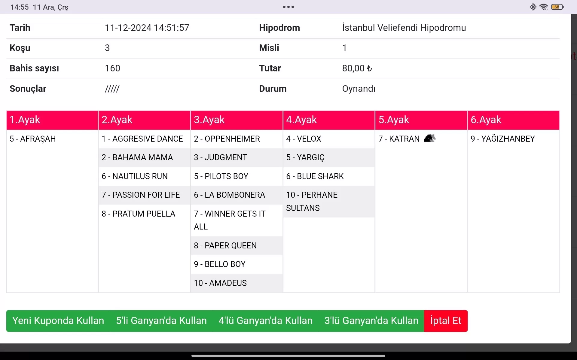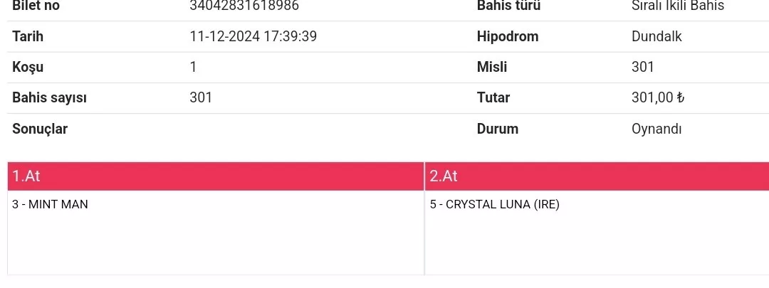 Kardes ,asagidada belirttim.dundaök 1.kosu 3,5 ikilinin disina pek cikmaz gibi.3 cok cok önde gibi.jombinede yapabilirsin,,3 önde arkasi 5 tek kalem de oynayabilirsin.at yarisi bu,garanti yoktur ancak ihtimali cok yüksek olan bi ikili..