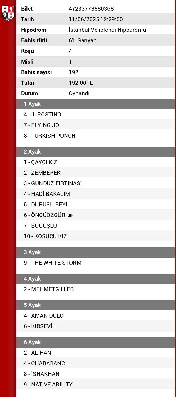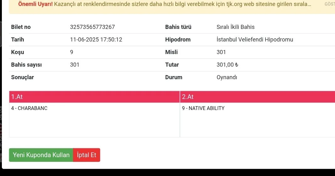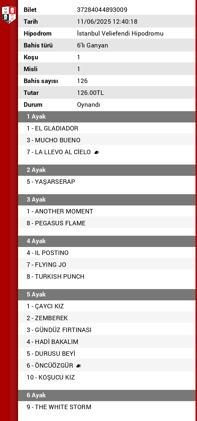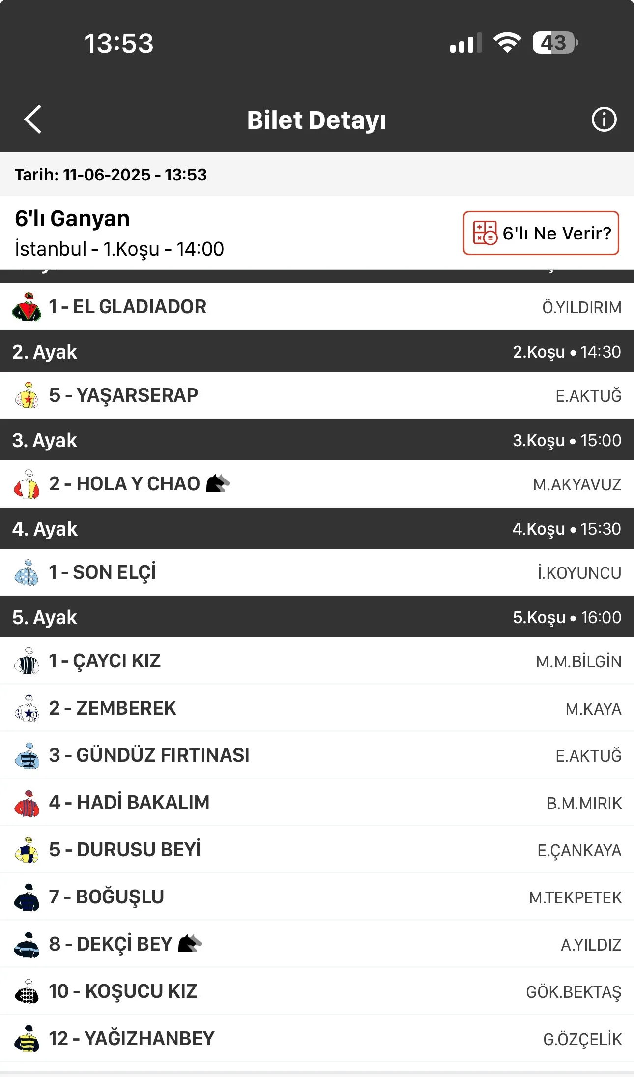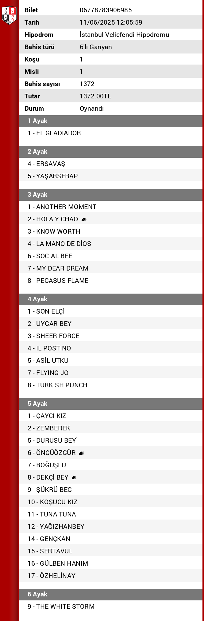 Bilet no 37759231771313 Bahis türü 6’lı Ganyan