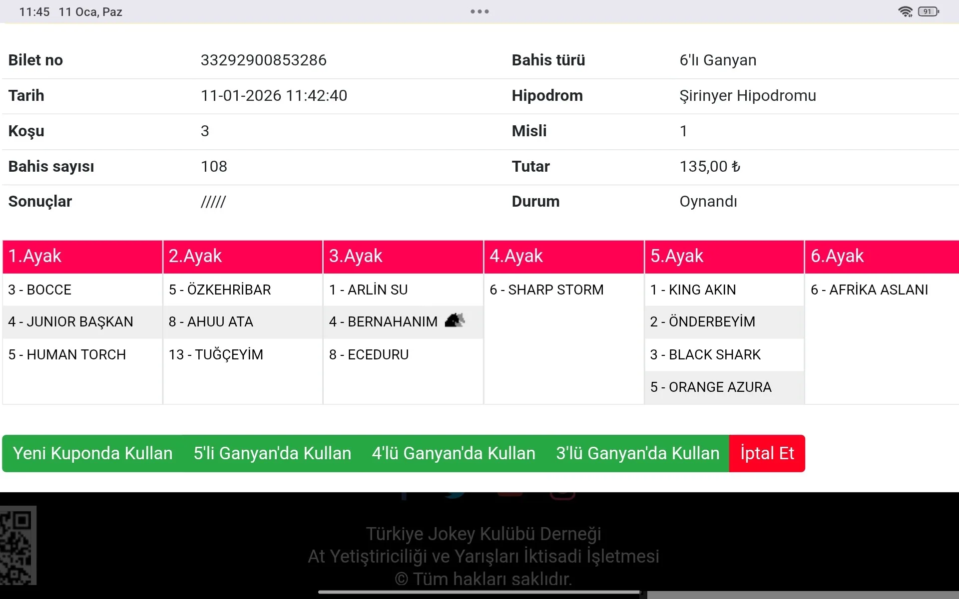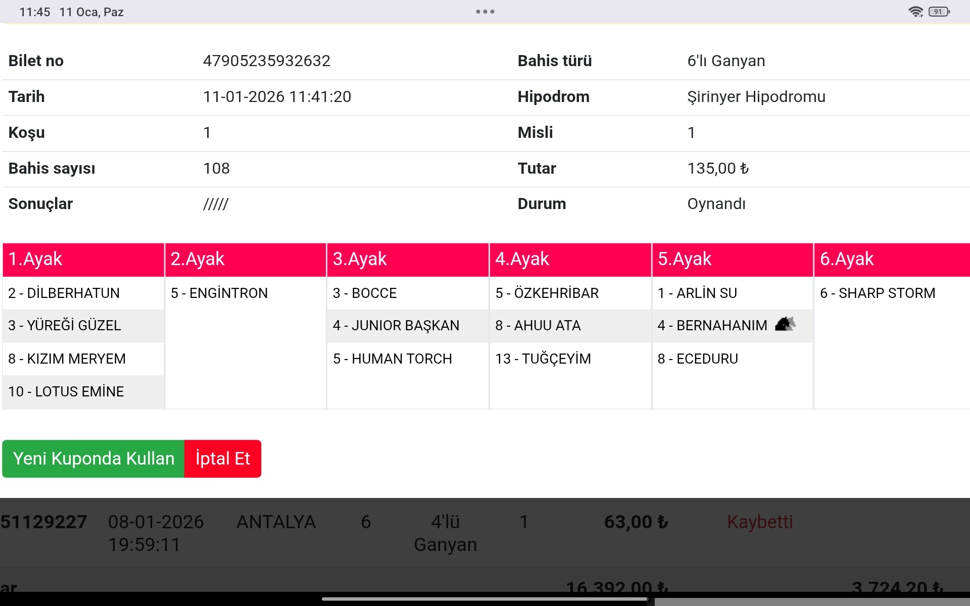 4.KOŞU: 3 SULTAN NENE tam bir emekçi. 3 yaşından itibaren soluskuz koşuyor. Aralık ayında 5 kere koştu. Çizgisini hiç bozmadı ki bu gruptada bozmazsa kazanabilir. 13 TUĞÇEYİM sinyali verdi oldukça cazip olacaktır. 6 TÜRKAN HANIM olmazsa olmaz. 10 KENSHİN, 2 BENDEME, 5 ÖZKEHRİBAR diğer şanslı isimler. Sanırım geriye bir iki sürpriz ve plaseler kaldı. Onlarında riskini alıyorum.
