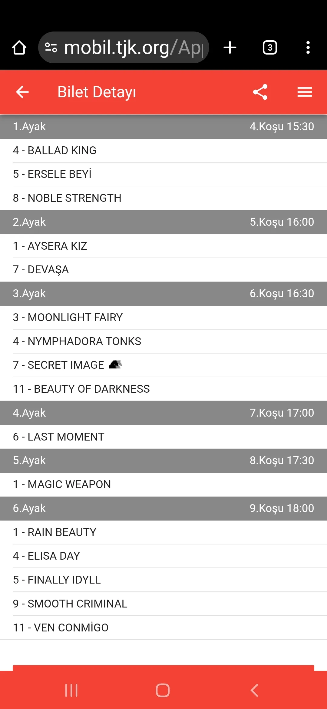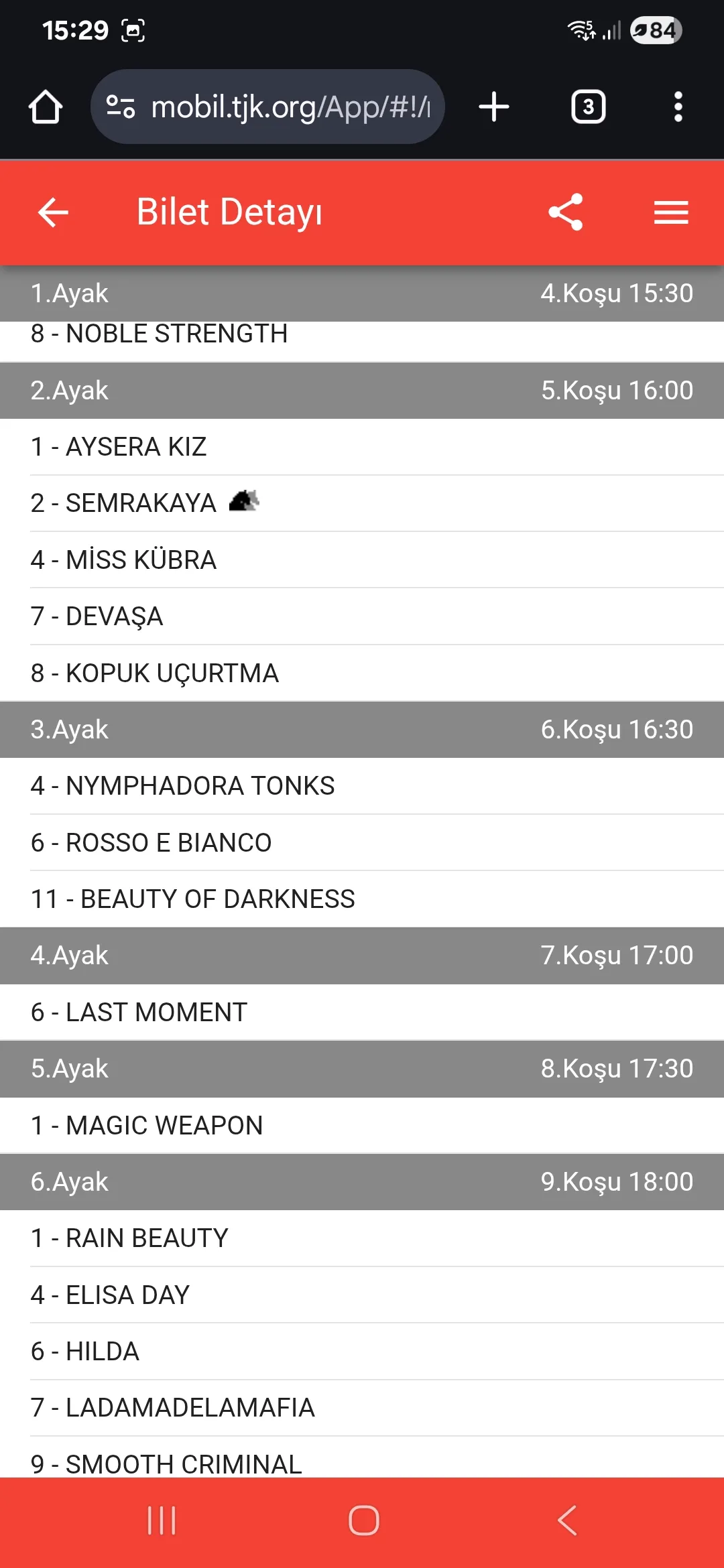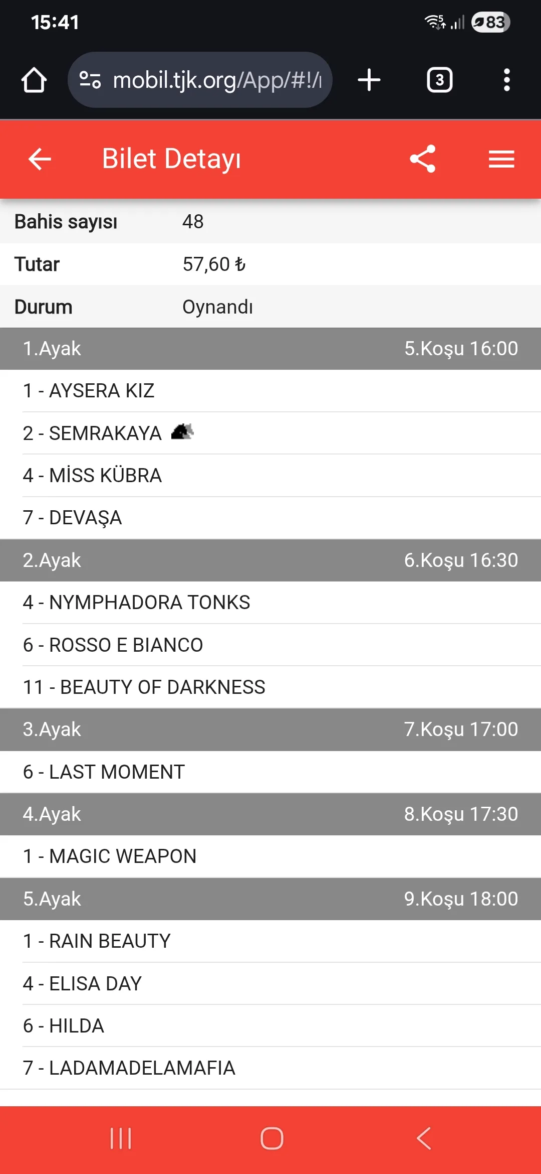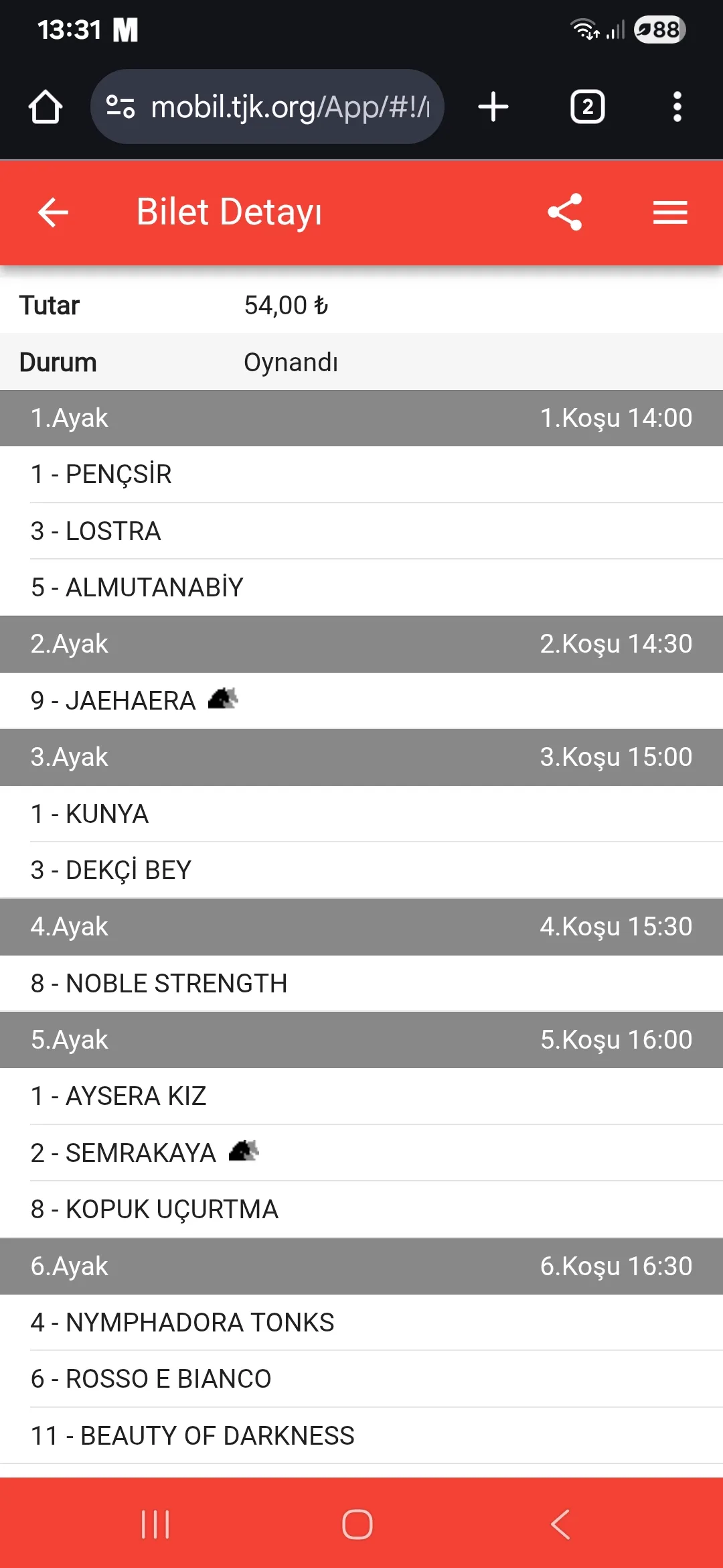 6.KOŞU: 4-NYMPHADORA TONKS ve 2-ETSUKO önde gördüğüm isimler..1-ESTIMATE , 11-BEAUTY OF DARKNESS ve 6-ROSSO E BIANCO şanslı gördüğüm diğer isimler..3-MOONLIGHT FAIRY ve 9-SPLENDID sürpriz…