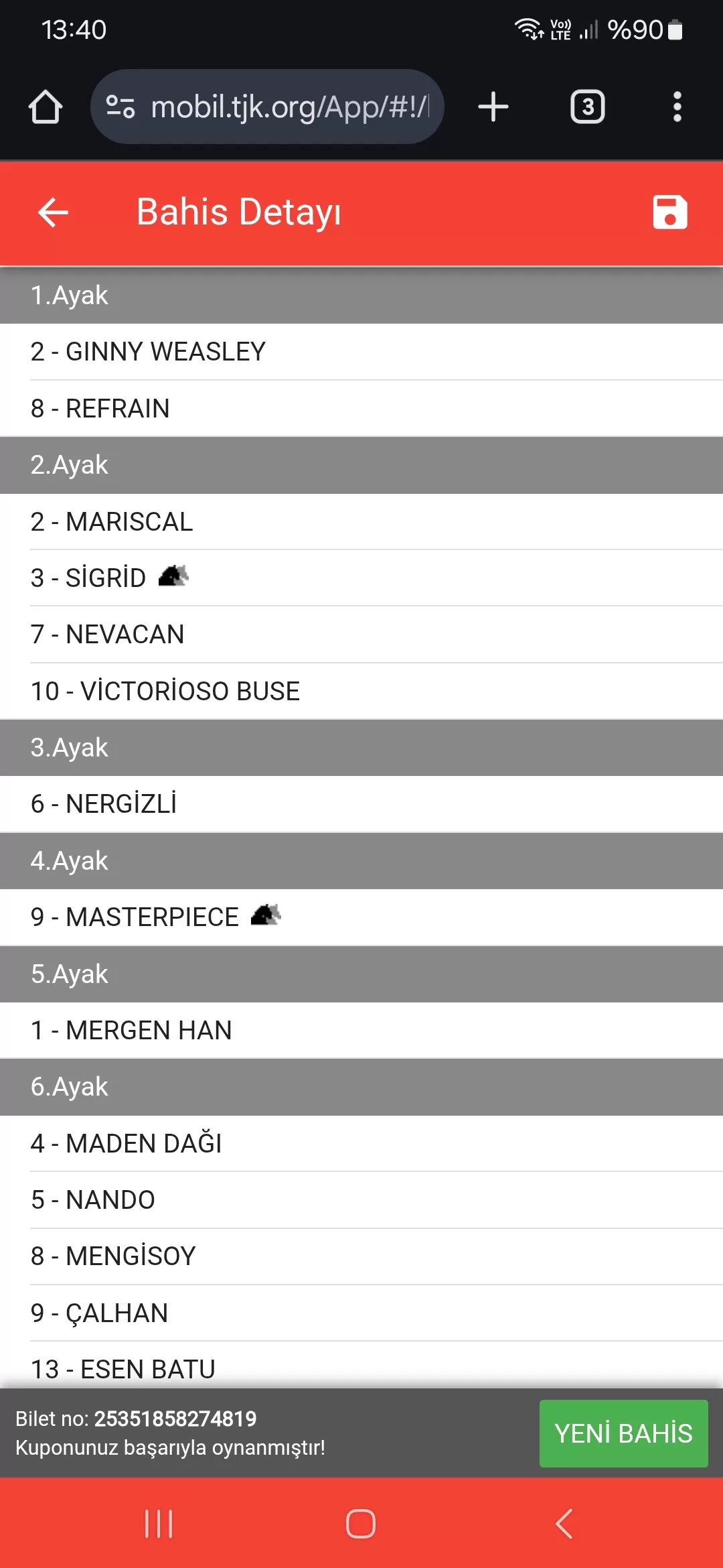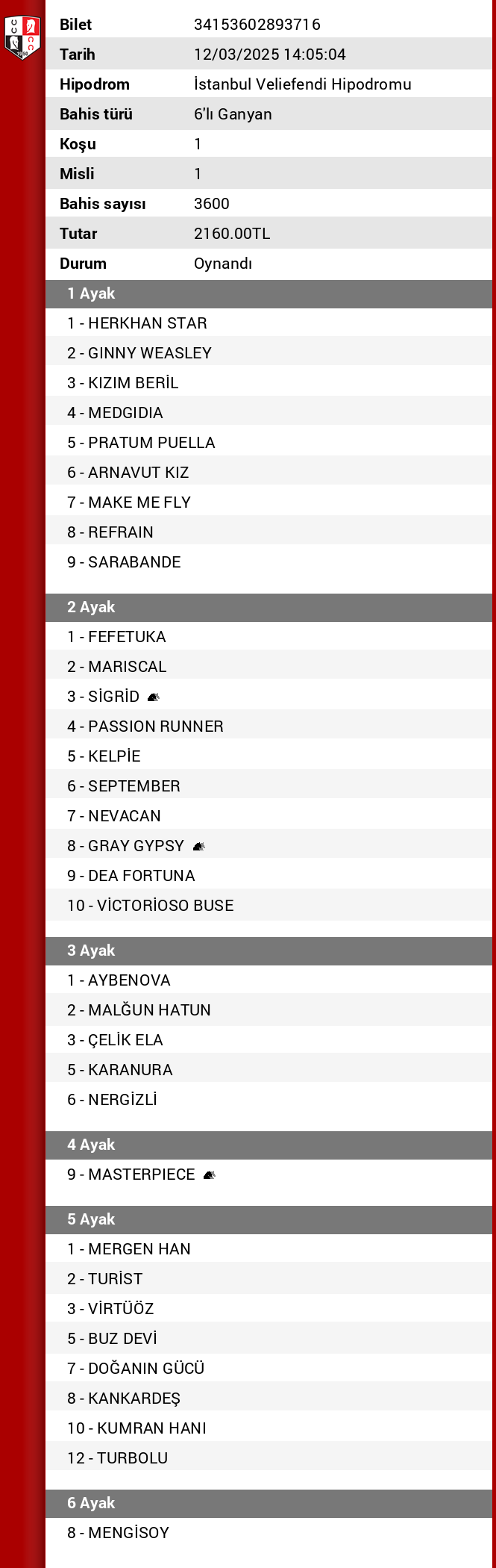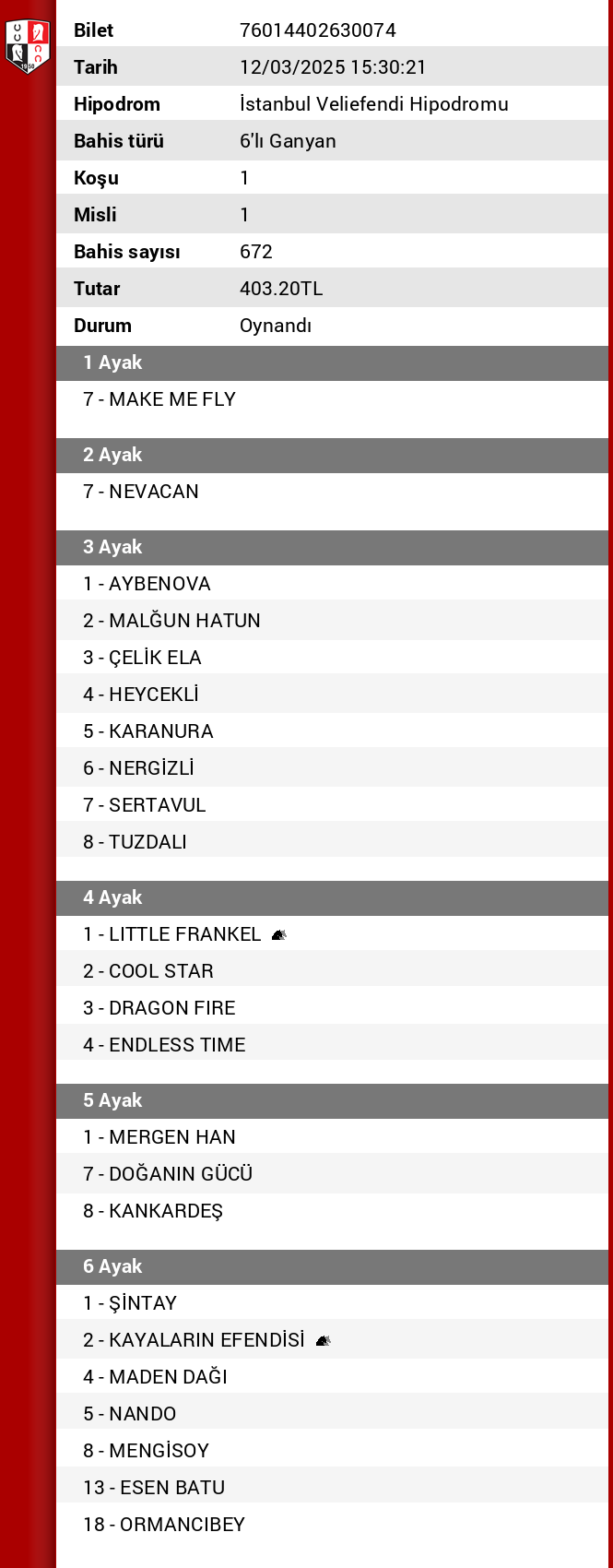 Bilet no 46507786653511 Bahis türü 6’lı Ganyan