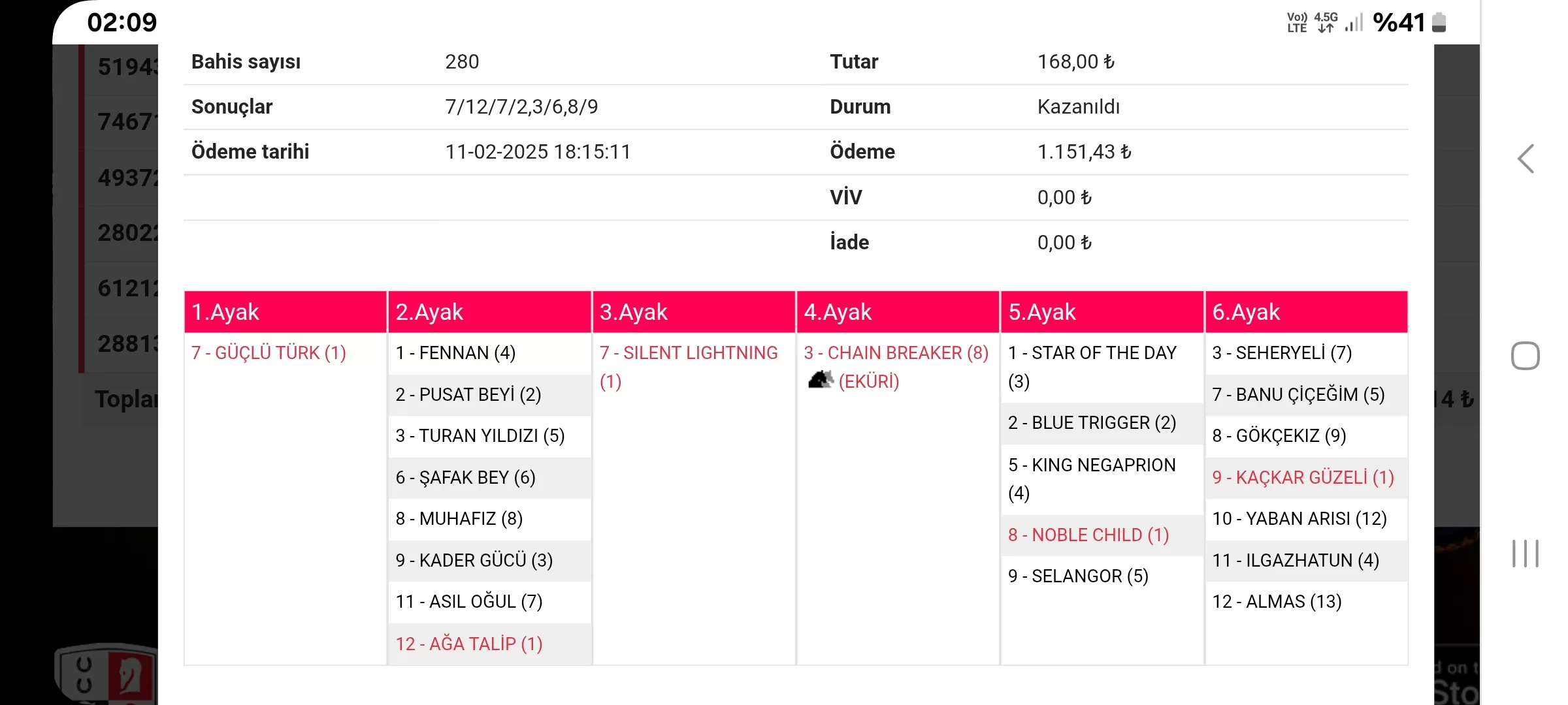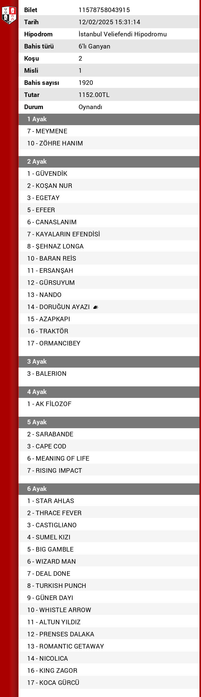 Bilet no 63098399167784 Bahis türü 6’lı Ganyan
