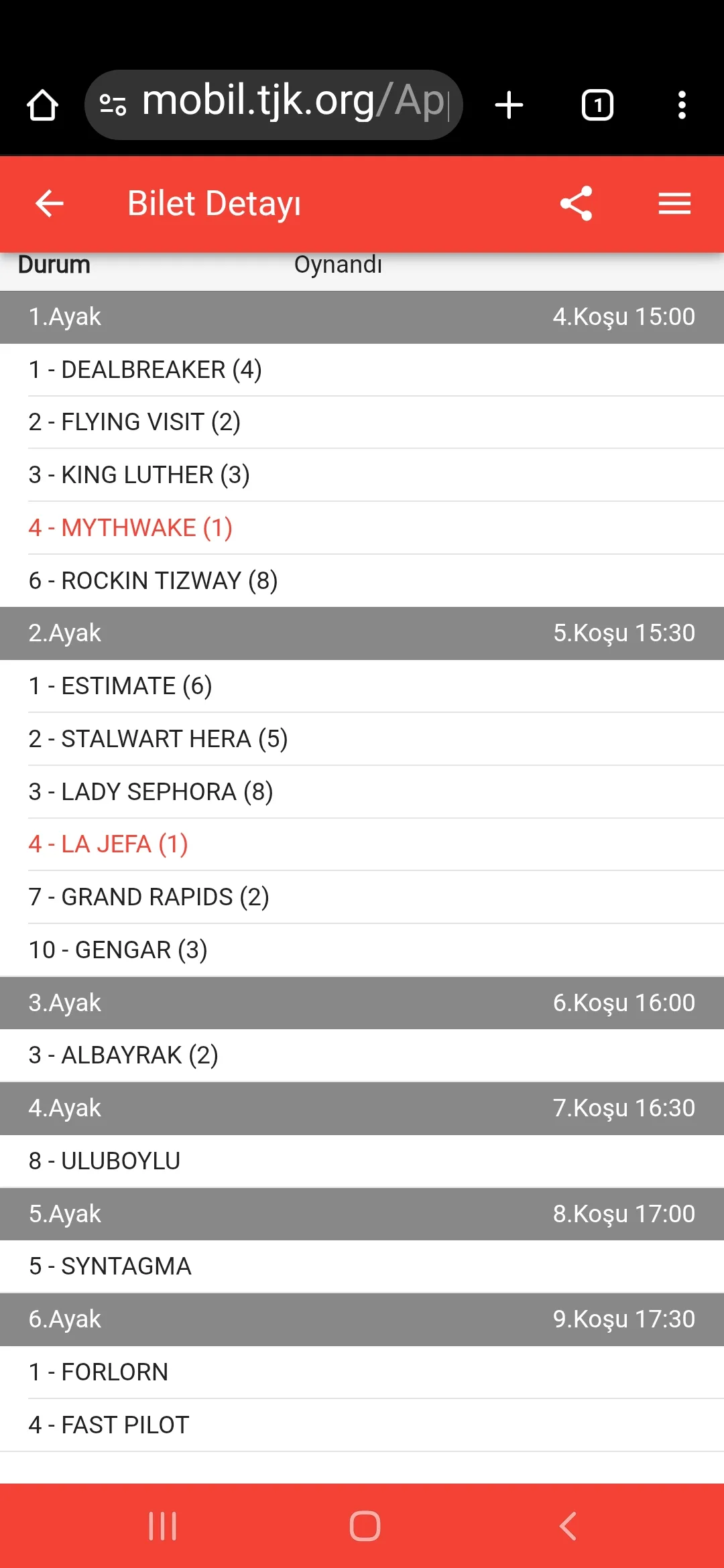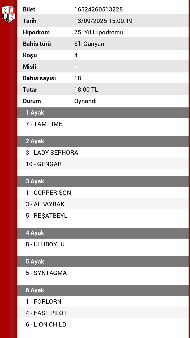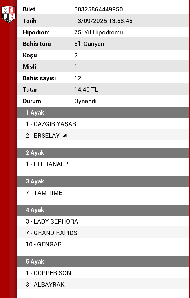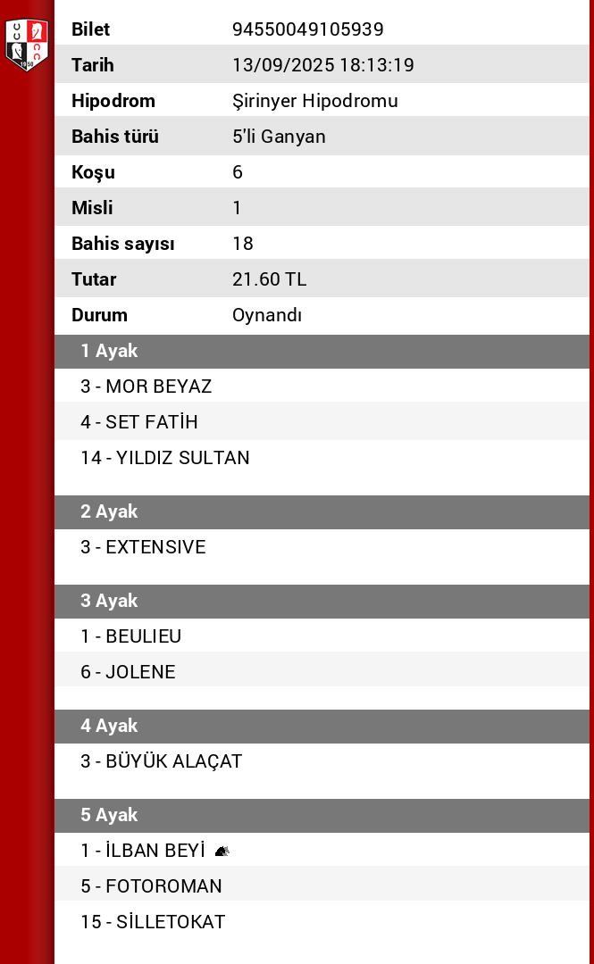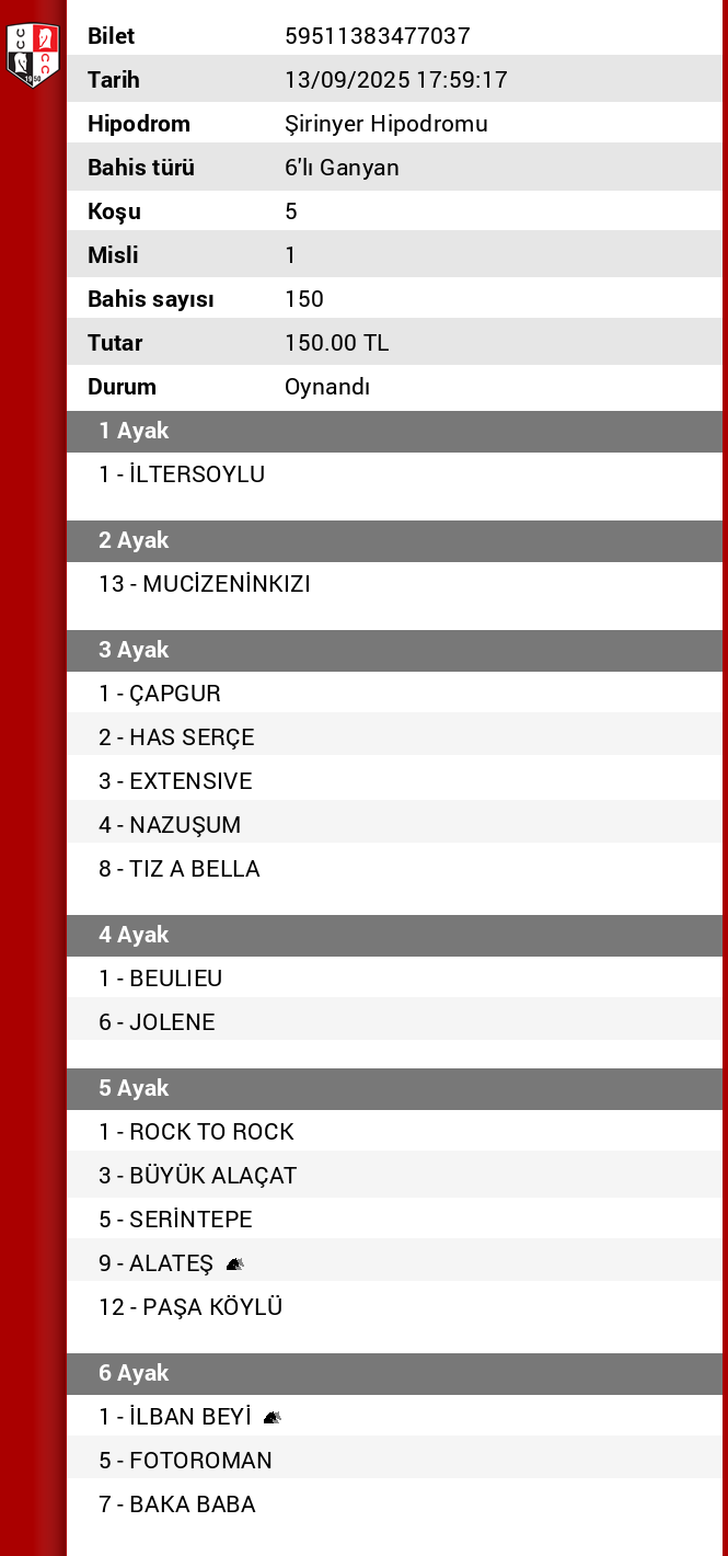 Bilet no 27967964131356 Bahis türü 6’lı Ganyan
