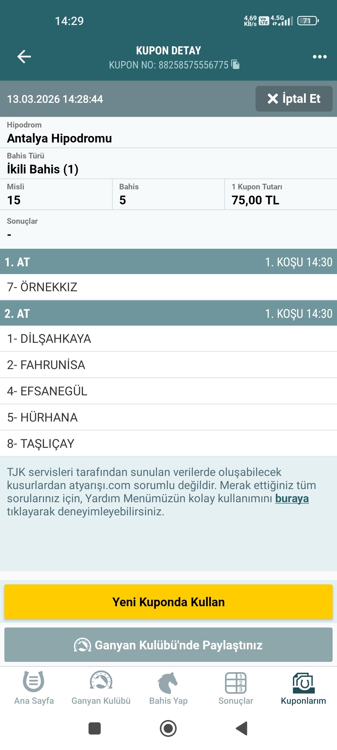1.koşu : 2 FAHRUNİSA 1 DİLŞAHKAYA 7 ÖRNEK KIZ 4EFSANEGÜL yazılabilecek isimler gibi duruyor