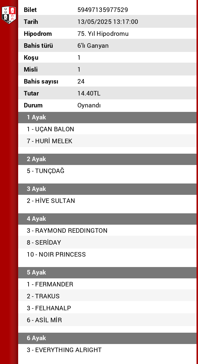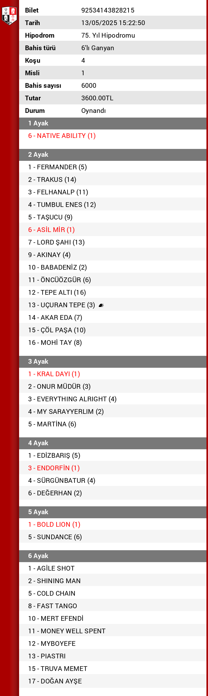 8.KOSU))) tam 1 BOLD LION a göre bir yaris.annesi GURU RINPOCHE güzel bi atti.yanlis hatirlamiyorsam yumusak ve agir pisti iyi kosardi.niyeyse Ankara da biraz agir pist olacak durumu var bende ,bilgisi olan bilgilendirsin lütfen.tek yazilabilecek bir isim bana göre.sonrasi karisir.