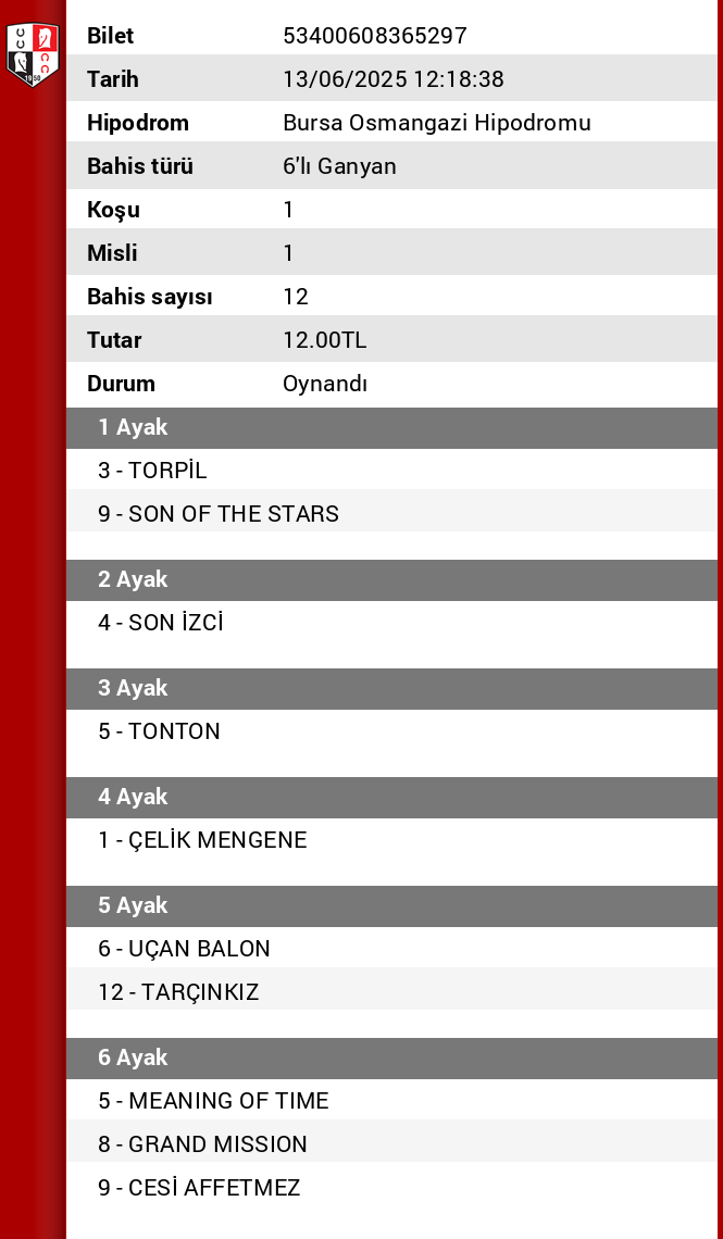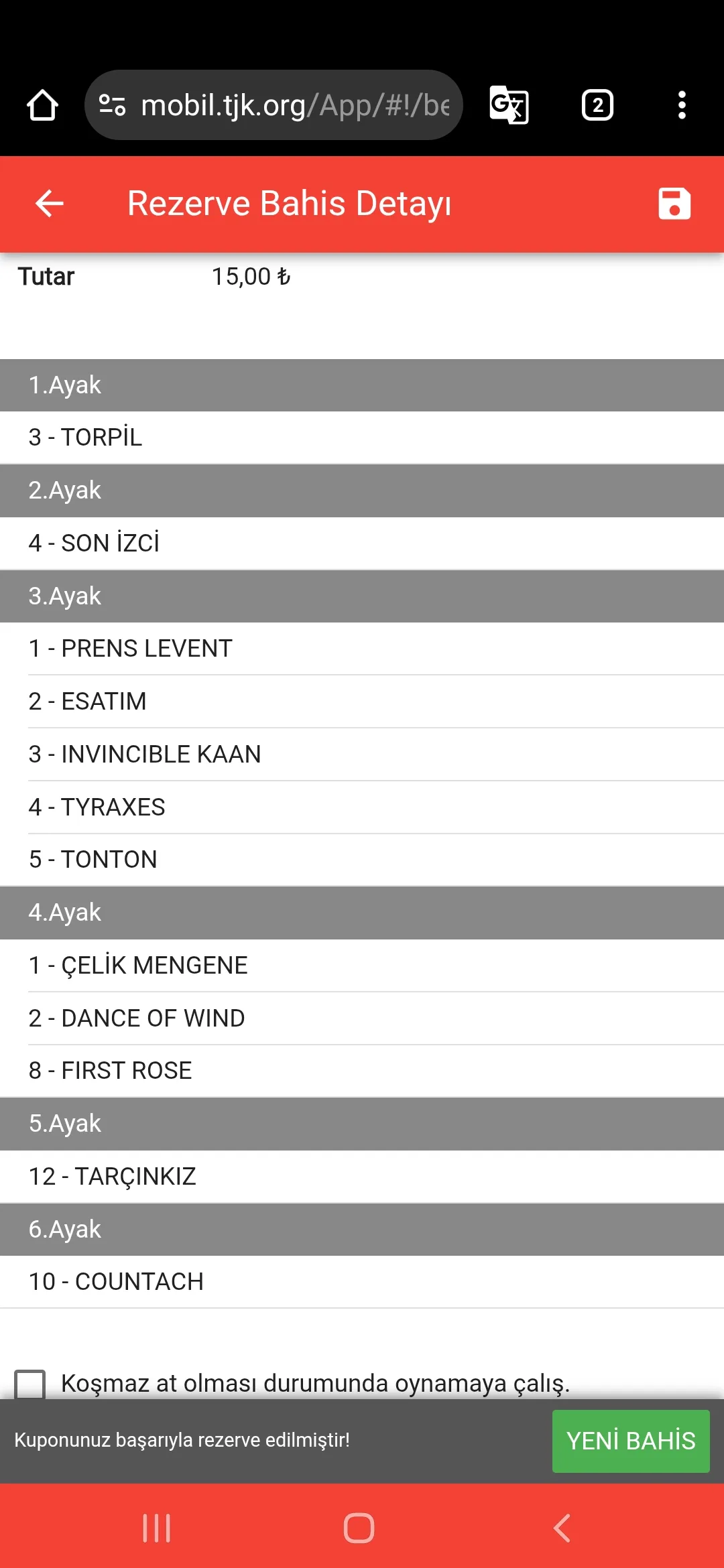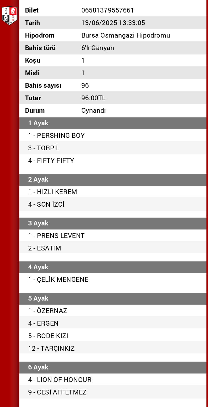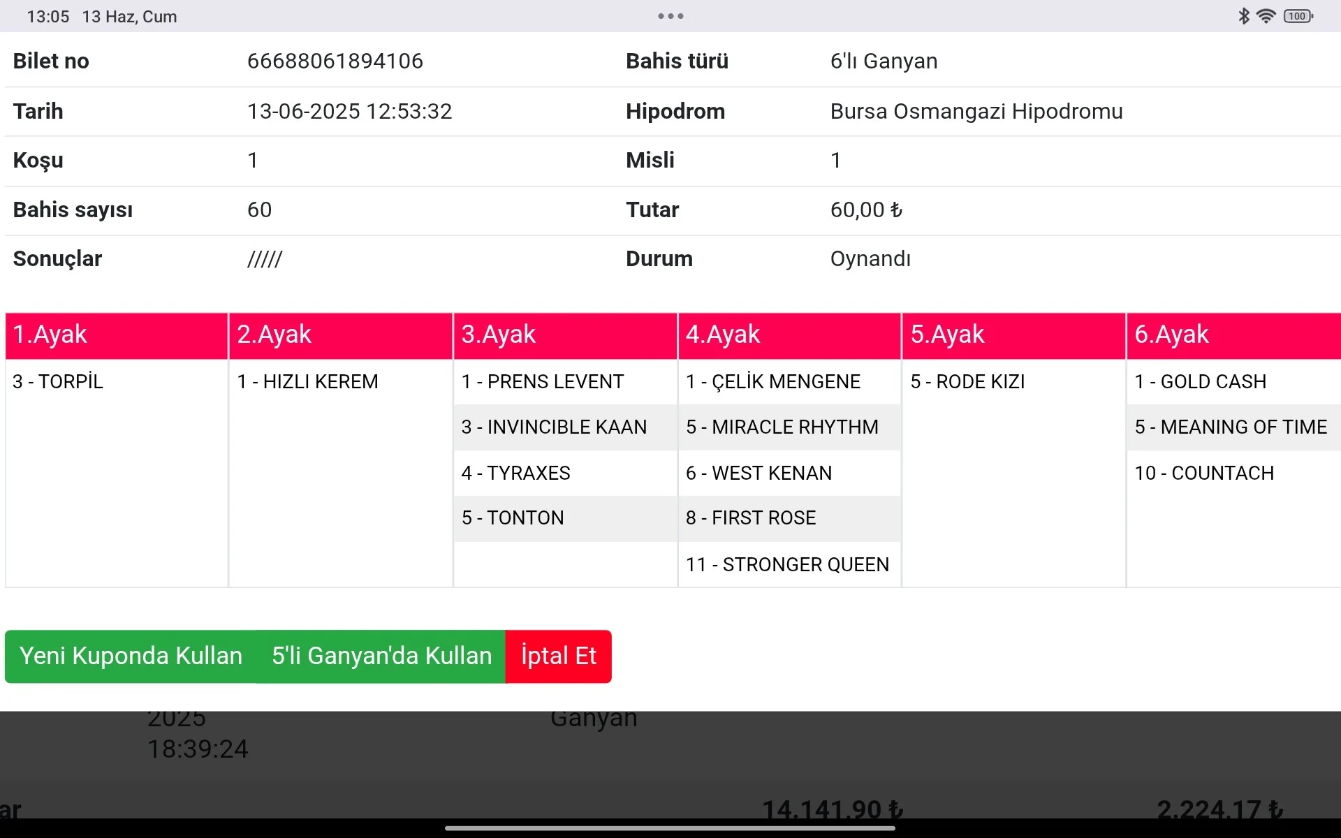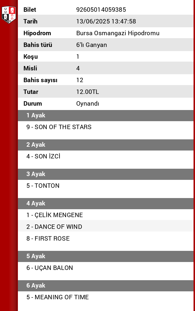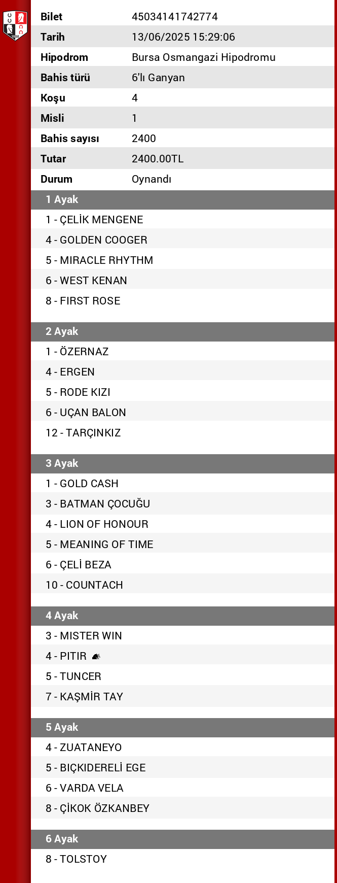 Bilet no 88097832680744 Bahis türü 6’lı Ganyan