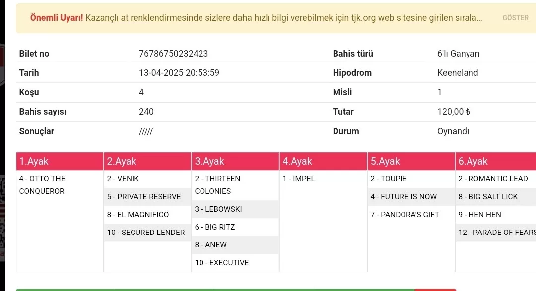 Bilet no 71226595192166 Bahis türü 6’lı Ganyan