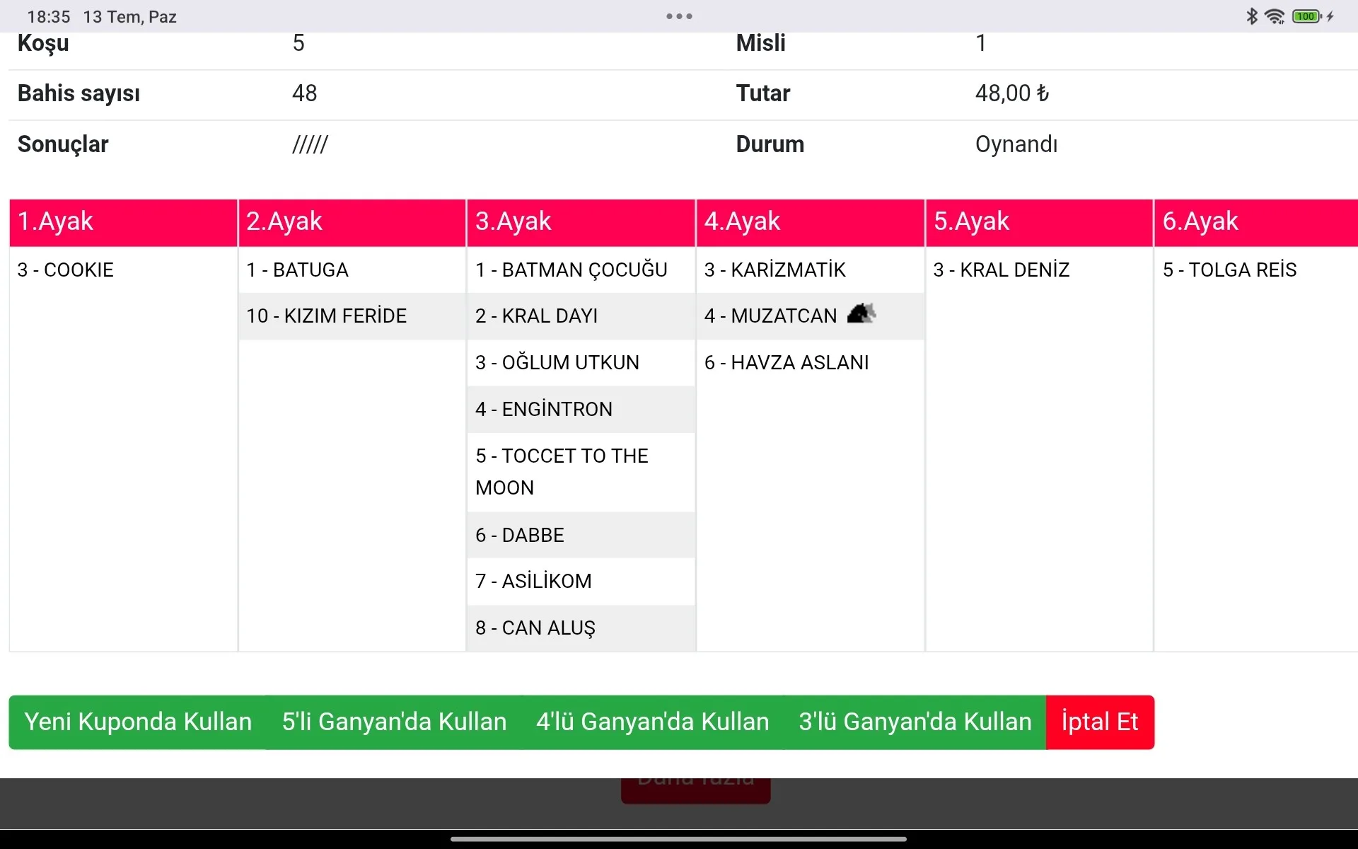 aynen Adminim. Ben haftada 4 gun hatirliyorum sanki, yaniliyor olabilirim tabi. Sali, persembe, cumartesi ve pazar gunleri. Tek 6’li ve tek 3’lu ganyan. bunlarin disinda 2li ve tabela ve ganyan.. Simdi cidden nevrimiz donuyor.