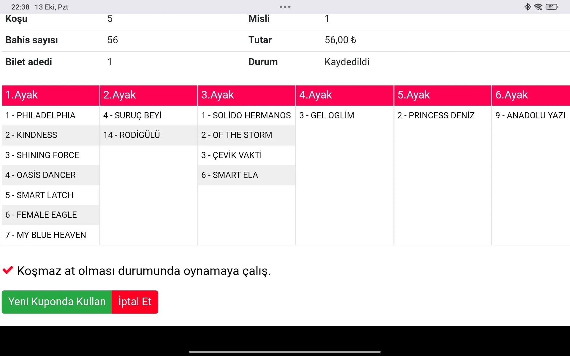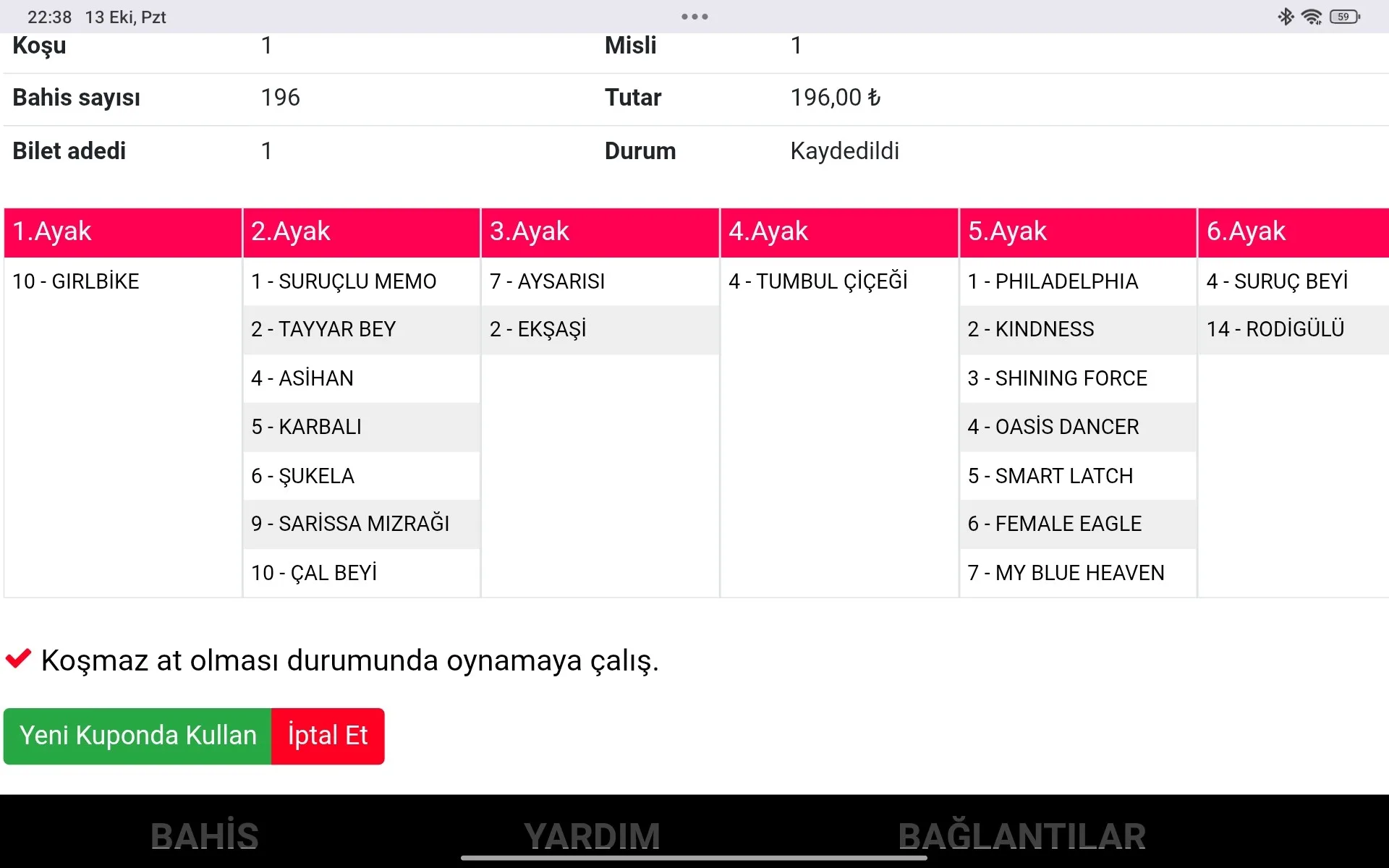 et no 19166785347489 Bahis türü 6’lı Ganyan